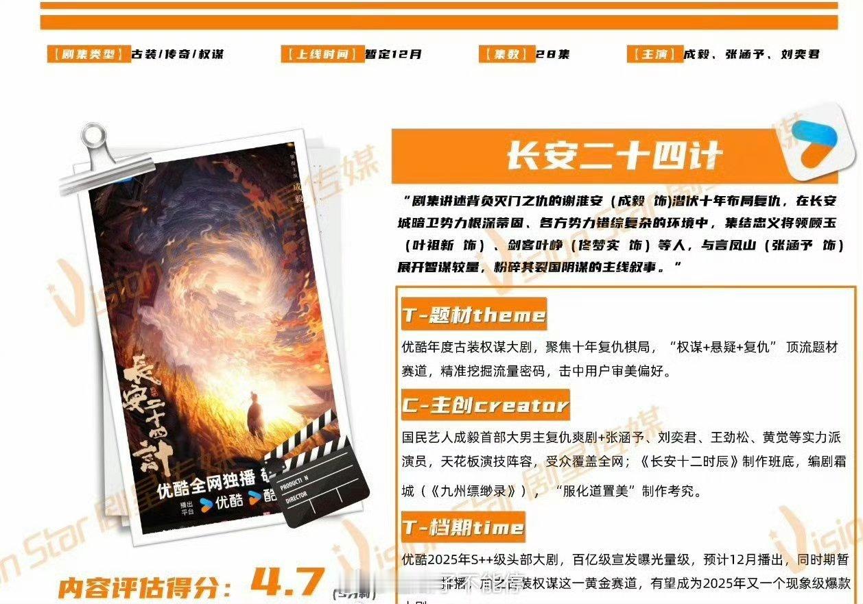 成毅长安二十四计 开始招商,总结了三个亮点:1、题材:权谋、悬疑、复仇2、大男主成毅+还有好几个实力派演员3、档期,预计12月播,S++