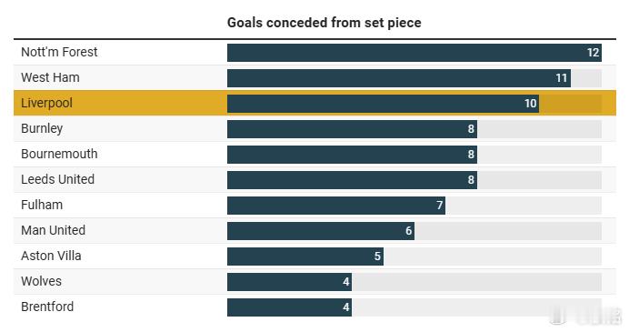 斯洛特可能平时根本不练角球防守。森林这场比赛第一个角球,就制造了第一个进球。范戴克的头球解围看起来更像是进攻队员的头球后蹭。利物浦平时是怎么练定位球防守的呢?如果说一次两次丢球还说得过去,但本赛季利物浦10次定位球丢球了,只有森林和西汉姆联的定位球防守更糟。阿森纳只丢了3个,热刺更少,2个。