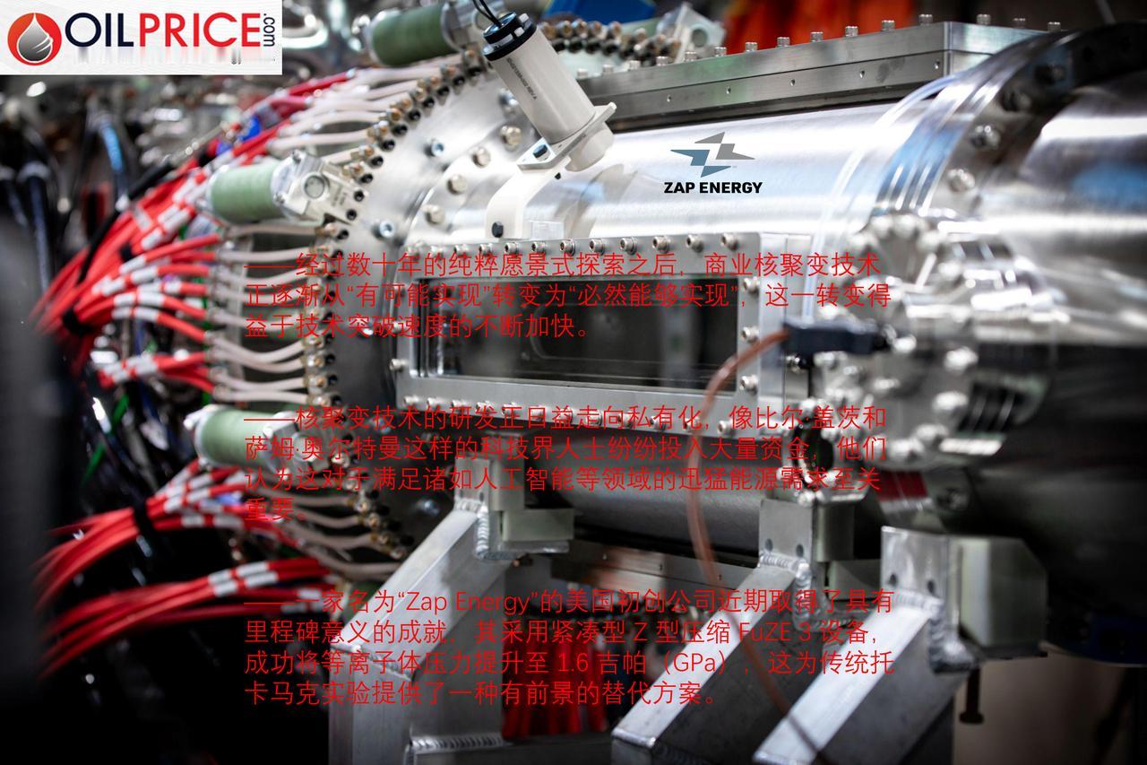 初创企业的突破加速了核聚变能源竞赛的进程,核聚变商业化快到了吗? 数十年来,人们一直都在开玩笑说,核聚变技术永远都还遥不可及,距离实现还有 30 年之遥。在地球上利用太阳所释放的能量这一过程,曾是一个脱离现实、充满幻想色彩的高深理论设想,更像是科幻小说中的情节,而非基于实际可行性的考量。但近来几年,技术突破的速度呈指数级增长,最终使得商业化的核聚变成为一种必然,而非遥不可及的幻想。 要在地球上实现核聚变,需要极高的温度——大约 1 亿摄氏度——并且还需要能够承受并维持这种高温的昂贵材料。由于进入这一领域的门槛极高,大多数核聚变实验都是由国家政府资助和管理的大型项目,或者像世界上最大的核聚变实验“国际热核聚变实验堆”(ITER)那样,是由六个国家和欧盟组成的财大气粗的联合体来负责的。 但随着人工智能繁荣的持续发展,能源需求的预测值不断攀升,商业核聚变技术的竞争正变得愈发私有化,因为科技行业也参与到相关的研究与开发当中。核聚变作为一种潜在的清洁能源“圣杯”,受到了极大的关注,因为它能够提供几乎无限的零碳能源,而且不会产生与核裂变相关的任何有害核废料。 一些科技界的巨头,包括比尔·盖茨和 OpenAl 的萨姆·奥尔特曼,都是核聚变技术的坚定支持者,他们认为核聚变技术对于推动科技行业的人工智能至关重要。“如果你懂得如何建造核聚变发电站,那么在任何地方、永远都能获得无限能源。这种影响之重大,简直难以言表。”盖茨在 10 月份的一篇文章中写道。“电力的可用性和价格是当今几乎所有经济领域的一大限制因素。消除这些限制可能会带来如同工业革命前蒸汽机发明那样的变革性影响。” 目前已有 12 家不同的核聚变初创企业各自筹集到了超过 1 亿美元的资金。其中一些核聚变初创企业能够比那些由政府支持的大规模项目更快地调整和适应,它们正在以惊人的速度取得技术突破。 就在本周,美国一家名为“Zap Energy”的初创公司(它是 12 家已获得超过 1 亿美元融资的公司之一)宣布了该领域最新的突破性成果。该公司在上周于加利福尼亚州长滩举行的美国物理学会等离子体物理分会会议上宣布,他们已达到与地球地壳深处所发现的等离子体压力相当的水平。 这家总部位于西雅图的初创公司正在采用一种名为“Z 线圈”的实验技术,这是一种利用电流产生磁场以控制和容纳等离子体的系统。随着核聚变研究领域变得愈发多样化且竞争激烈,实现等离子体的方法也变得多种多样起来。虽然最古老且规模最大的实验使用的是托卡马克装置——巨大的环形机器,通过磁铁来控制等离子体,而一些最成功的核聚变实验则是利用激光控制的,但“Z 线圈”装置作为一种有前景的替代方案正在逐渐崭露头角。 Zap Energy 公司最新研发的原型设备——融合 Z 型压缩实验 3 号(FuZE-3)装置,能够在更紧凑的系统中实现极高的压力和温度。与现有的领先方案相比,该装置的结构更为紧凑。“能够独立控制等离子体的加速和压缩,为我们提供了新的调节手段,以调整物理参数并提高等离子体密度。”Zap Energy 实验物理部门负责人科林·亚当斯向Interesting Engineering网站介绍道。“双电极系统在加热方面表现良好,但缺乏我们理论模型中所要求的压缩效果。” 这一突破本身还不足以促成商业核聚变的实现,但它却是众多令人振奋的里程碑之一,证明了那个原本只存在于梦想中的成就如今已近在咫尺。而Zap Energy公司认为,其“FuZE-3“机器将对这一成就起到关键作用。正如Zap Energy公司研发副总裁本·莱维特在最近的一份新闻稿中所写:““FuZE-3“是最近才建成并投入使用的,我们正在生成大量高质量且具有高重复性的数据,并且我们还有很大的发展空间来继续在核聚变性能方面取得快速进展。”