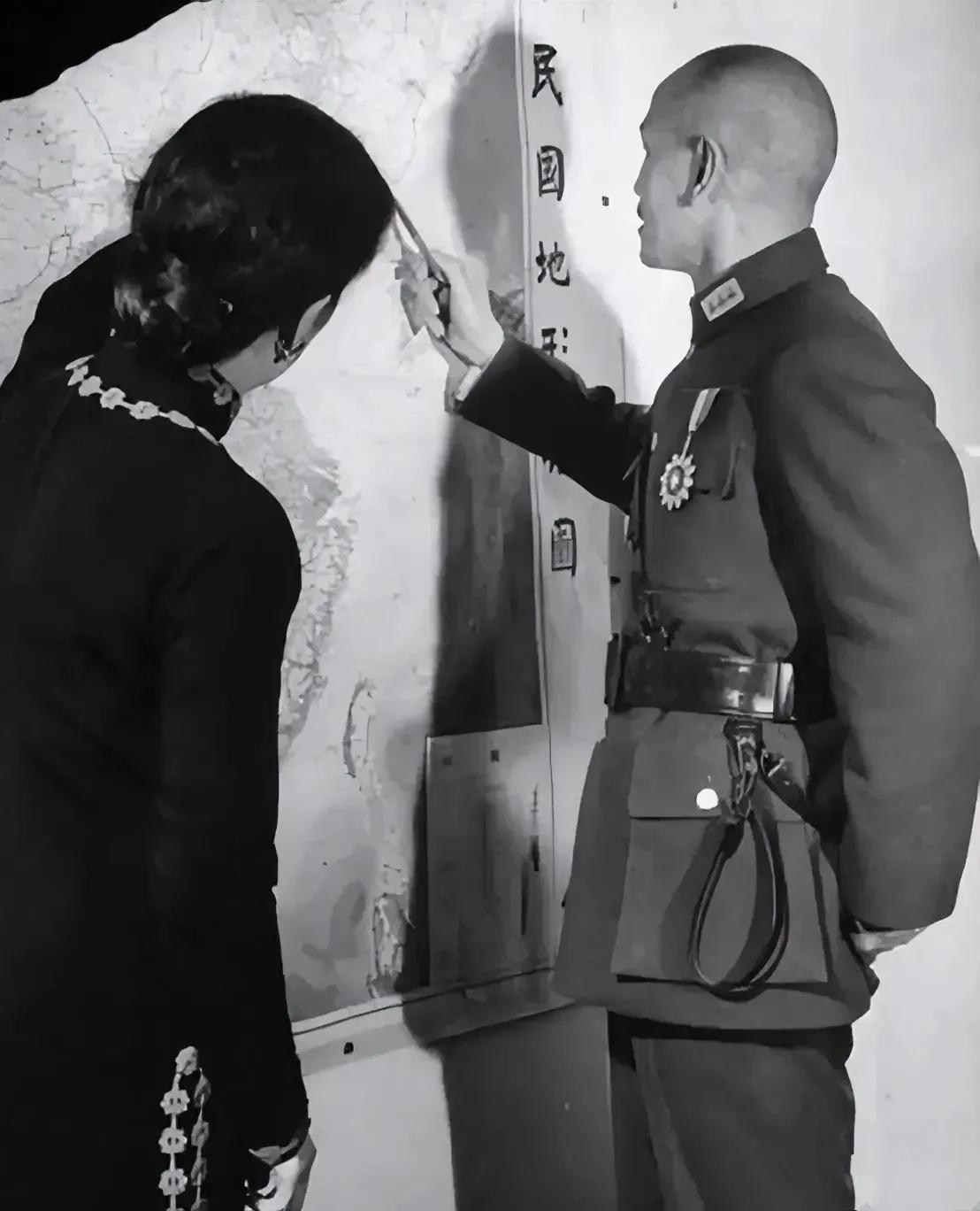 这是蒋介石两口子在看中华民国形势图,也真是难得的一张照片。 看看蒋介石