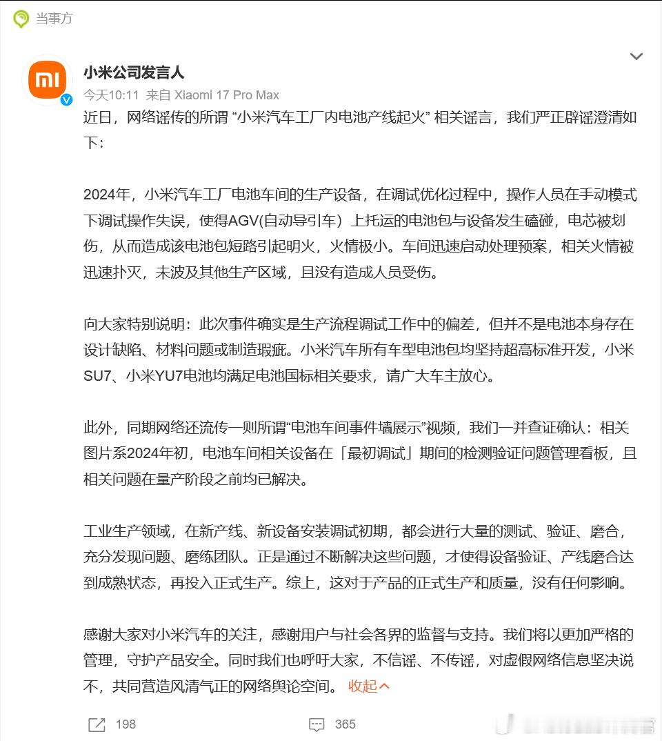 小米官方辟谣了电池产线起火的新闻,表示是操作人员在手动模式下调试操作失误,使得池包与设备发生磕碰,电芯被划伤,从而造成该电池包短路引起明火,火情极小