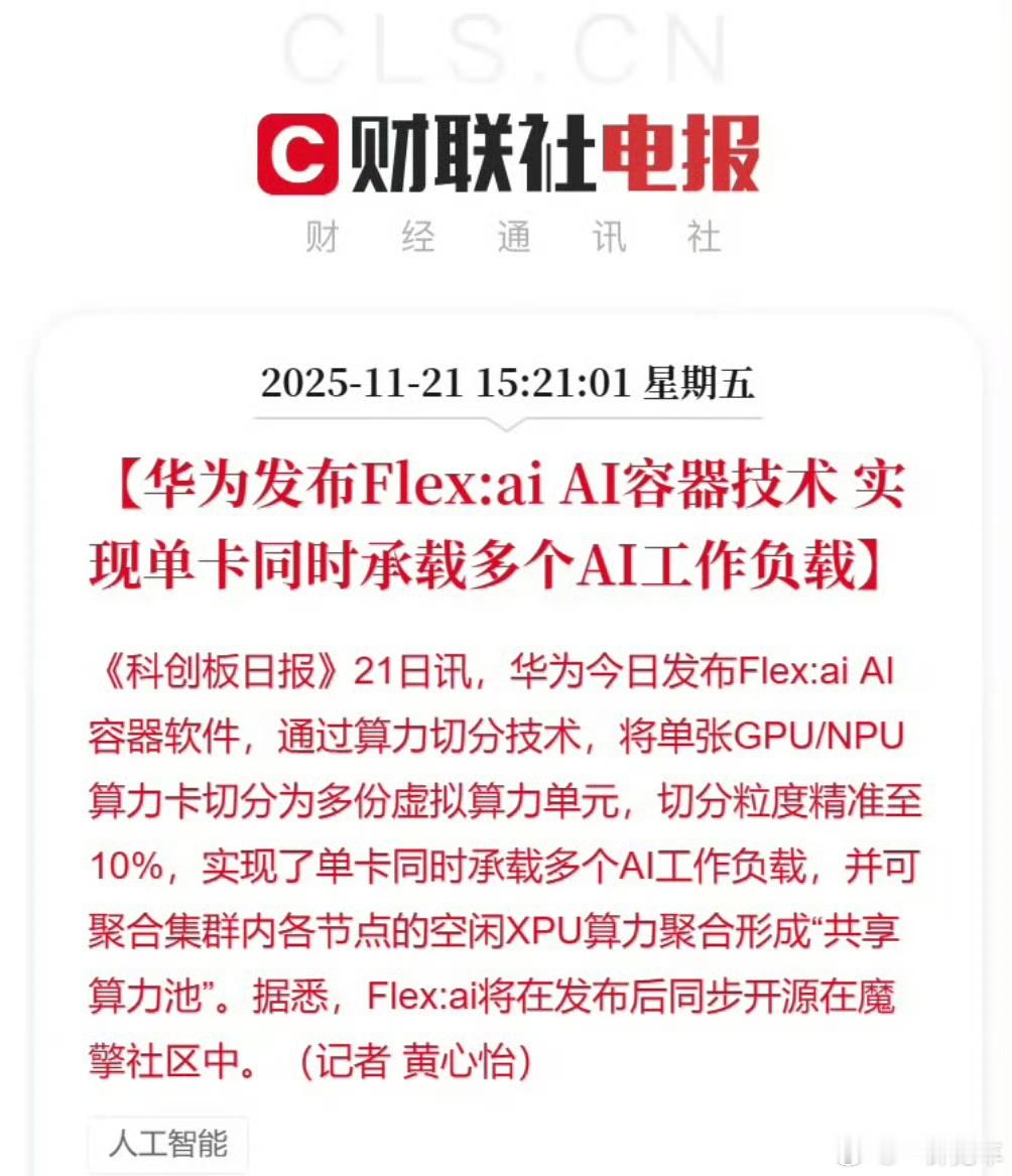 华为发布Flex:ai AI容器技术,大幅提升算力利用率。