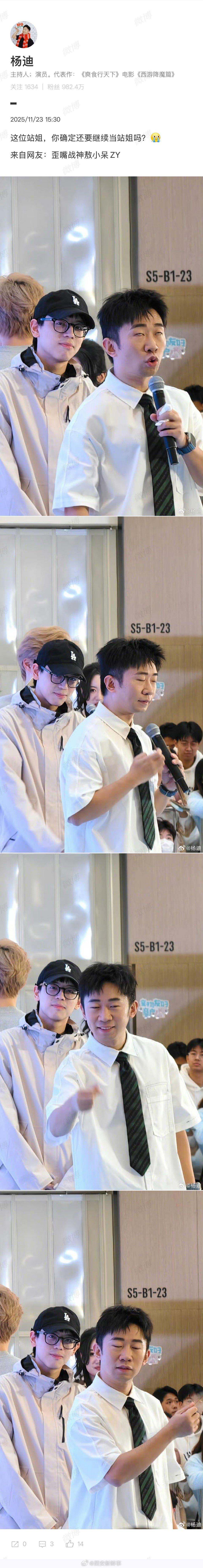 【】11月23日, 晒出参加活动时的站姐出图,配文“这位站姐,你确定还要继续当站姐吗?来自网友:歪嘴战神敖小呆ZY”。另外,他还在评论区回复“我睡眠真好,站着就睡着了”。