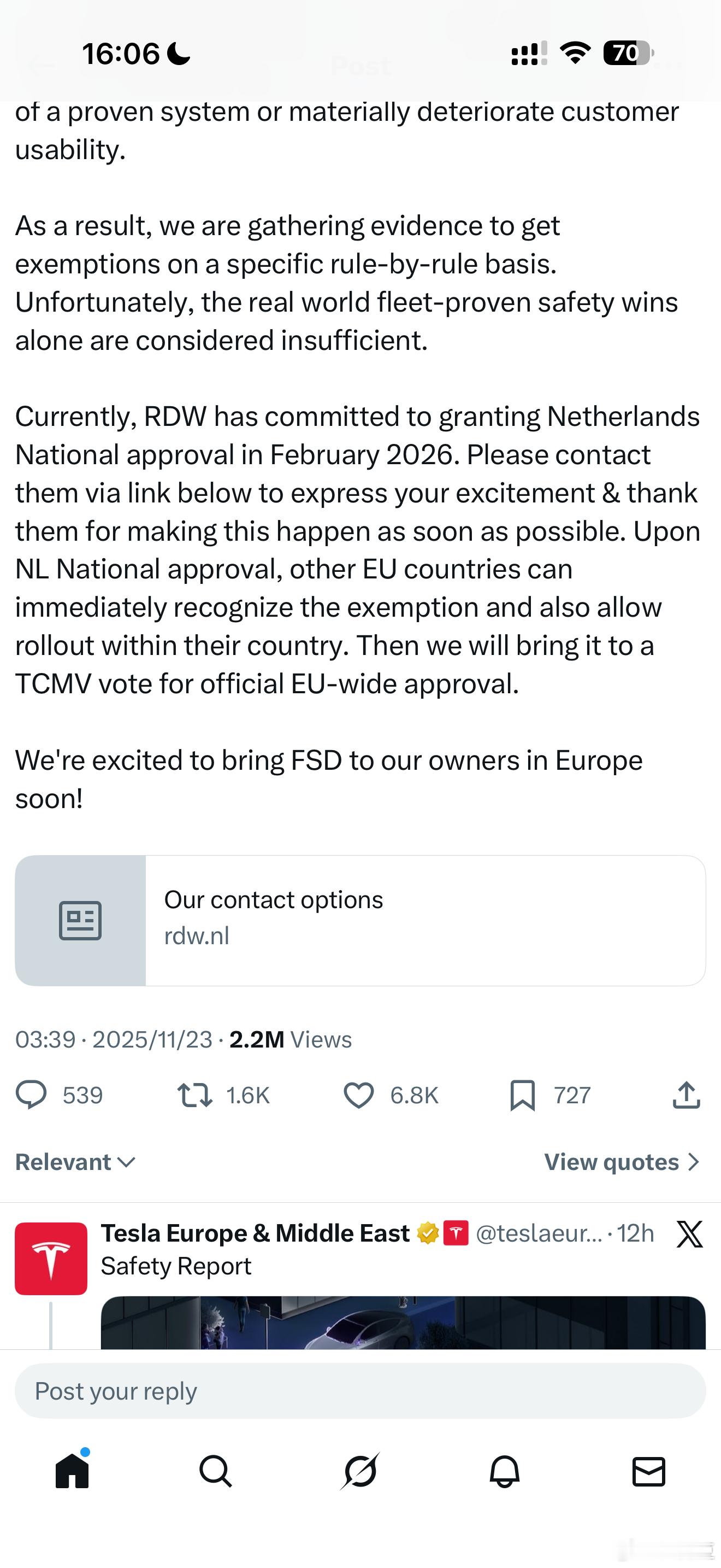特斯拉欧洲FSD也有进展,也可能在明年2月落地推送特斯拉在过去12个多月里一直努力争取在欧洲推出 Full Self-Driving(监督版)。我们已经几乎为欧盟每个国家的监管机构演示过 FSD。我们在可能的情况下申请了早期访问、试点发布计划或豁免。我们已经开发并分享了关于 FSD 的详细安全证据,这些证据现在在我们最新的《安全报告》中公开。我们还在欧盟17个不同国家的道路上安全行驶了超过100万公里(内部测试)。我们通往成功的主要路径是与荷兰审批机构 RDW 合作,争取获得该功能的豁免。这包括证明符合现有法规(UN-R171 DCAS)的要求,同时根据欧盟第39条申请豁免,针对尚未监管的行为,例如高速公路外的 Level 2 系统、系统发起的免手握方向盘换道等。其中一些法规已经过时且基于规则,这使得目前形式的 FSD 在法律上是非法的。如果为了合规而修改 FSD,会在很多情况下让它变得不安全且无法使用。我们已经在合理且逻辑的地方最大限度地调整 FSD 以符合法规,但我们绝不会牺牲已经验证安全的系统的安全性,也不会大幅降低客户的使用体验。因此,我们正在逐条规则收集证据以申请豁免。不幸的是,仅凭现实车队已验证的安全优势仍被认为不足以获得批准。目前,RDW 已承诺将于 2026 年 2 月授予荷兰国家批准。请通过下方链接联系他们,表达您的激动心情并感谢他们尽快实现这一目标。一旦获得荷兰国家批准,其他欧盟国家可以立即承认该豁免,并在本国允许推出。随后我们将提交给 TCMV 投票,争取正式的欧盟范围批准。我们非常期待尽快将 FSD 带给欧洲的车主!
