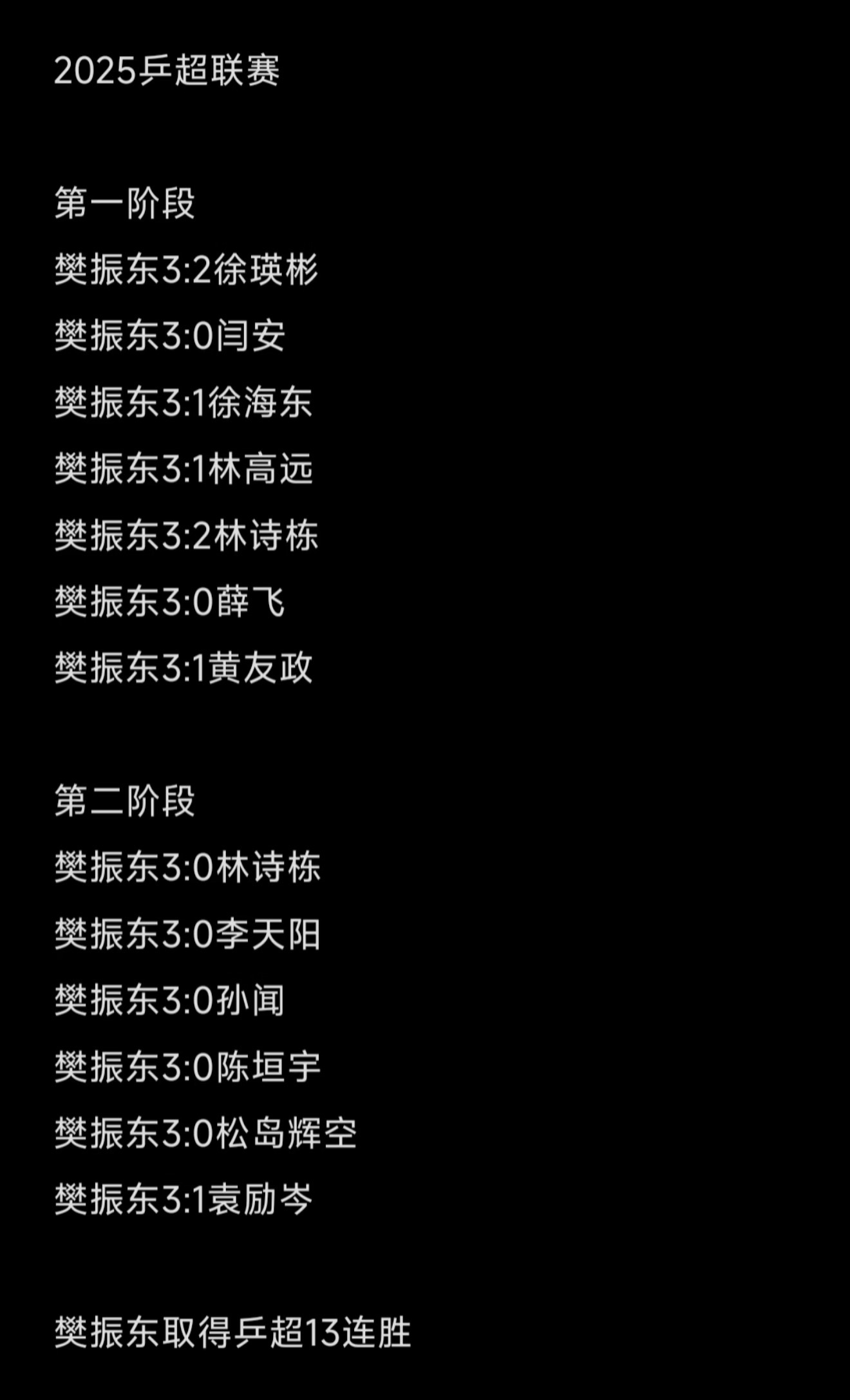 去德甲前乒超十三连胜,德甲后全运会十战十胜。半年内国内二十三连胜,樊振东牛