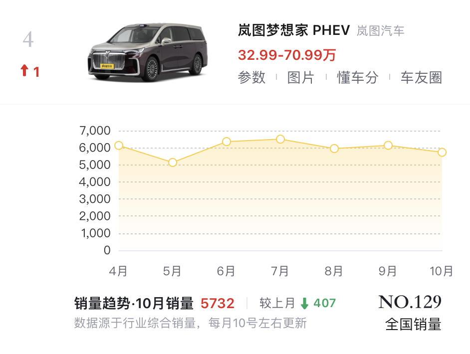 岚图梦想季是MPV领域,不分任何定语的榜单常客。但随着各家纷纷在MPV上推出四座超豪华版本,岚图自然也不能落下。在今年广州车展上,岚图正式推出旗舰四座 MPV—— 梦想家山河,售价 70.99 万元,尝试把安全、性能、奢华拉满——-智驾方面:搭载华为乾崑智驾 ADS 4 系统,27 个传感器 + 192 线激光雷达构筑全维安全防护-安全方面:2000MPa行业顶级强度防撞梁 + 琥珀电池 2.0-三电方面:全球首款 800V 智能超混技术加持,12 分钟就能完成 20%-80% 快充但我觉得这还都不是重点。岚图最近的一波成功,离不开整体内饰和外形的设计,背后的那种中式内涵的外显性表达——车身颜色叫做皓月紫云 / 拂晓金晖双色车身、其实就是上银下紫或者上金下黑,但是合理的搭配和解读,可以在这个车型的目标用户中间形成强烈的情感共鸣。特别是泰山,稳重的视觉比例和海外超豪SUV一致,但是细节的线条处理,又有着中国文化特有的圆润和温和。正是面对他们的目标用户——哪些经历过人生九曲十八盘,终于登上人生的南天门的中年人。今年下半年他们的重点,是“三旗舰” 同台亮相。从MPV梦想家山河,到SUV泰山,马上12月还有即将上市的轿车——追光 L,全套升级内外饰之后能不能扭转追光的销量。如果成功了,说明整套打法在中短期内可复制的成功。