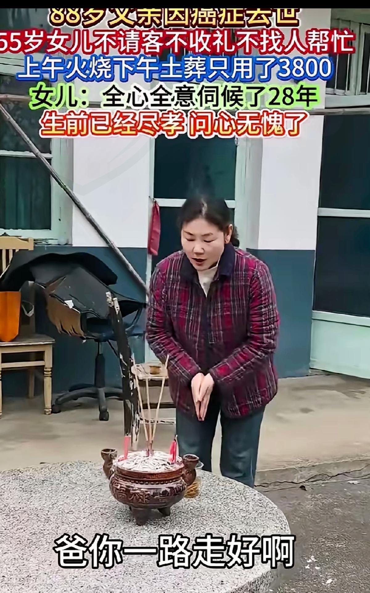 太通透了!55岁女儿送走88岁老父,不请客不收礼、不找人帮忙,上午火化下午入土,全程只花3800元,没办任何葬礼仪式,却活出了最真的孝道。 比起那些老人生前不管不顾,死后大摆宴席撑场面的伪孝,这才是清醒到骨子里的通透。葬礼本就是做给外人看的形式,铺张排场换不来心安,反而添了人情负担,真心尽孝从不在死后的仪式里。生前全心全意照料,把陪伴和关怀落到日常,没留半点遗憾,这份踏实比任何虚头巴脑的排场都珍贵。 孝从来不是演给别人看的戏,是问心无愧的付出,自己做到位、心里踏实,根本不用在意旁人闲言碎语。你认同这种简办丧事、生前尽孝的方式吗?孝敬父母 今日感悟来共享