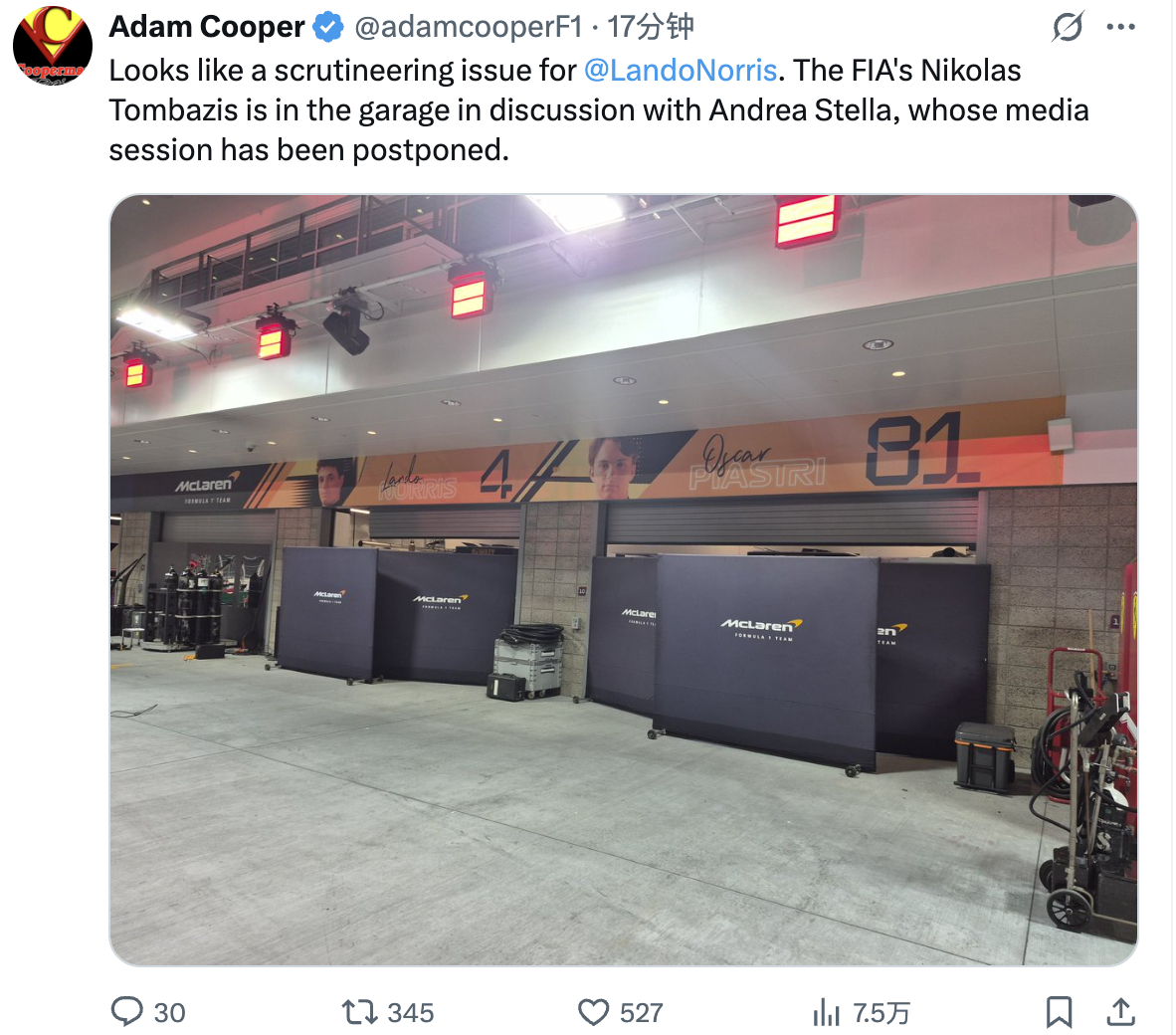 据therace报道,诺里斯赛车还没有从车检区中出来,FIA单座方程式总监通巴