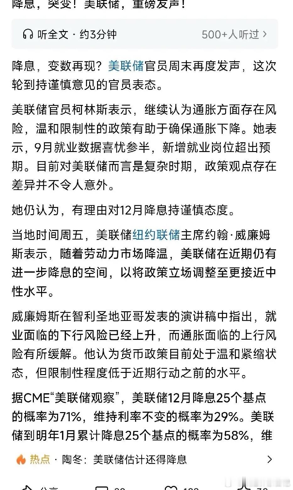 降息突变!美联储重磅发声,12月降息变数丛生据《证券时报》报道,美联储12月降息预期迎来转折,市场提前定价降息概率背景下,美联储内部政策分歧加剧、决策层投票权博弈升温,原本的降息共识逐步转向不确定性拉满的格局,核心逻辑与关键细节梳理如下:一、核心分歧:官员立场两极对立,降息走向难定市场对12月降息预期持续升温,但美联储官员围绕“是否降、何时降”分歧显著,直接放大政策不确定性,两大阵营立场清晰对立:1. 谨慎派:锚定通胀风险,反对过早降息以美联储主席鲍威尔、官员柯林斯为核心的谨慎派,核心顾虑聚焦通胀隐患未消。柯林斯明确表态,通胀仍存风险,维持温和限制性政策才能确保通胀稳步下行,且9月就业数据喜忧参半——新增岗位超预期背后,就业市场韧性或支撑消费需求,进一步推升通胀,因此对12月降息持谨慎态度。鲍威尔同步站队保守阵营,考量此前持续加息周期的通胀治理成果,认为政策转向需更明确的通胀回落信号,避免过早降息导致通胀反弹。2. 宽松派:聚焦就业压力,主张降息回归中性纽约联储主席约翰·威廉姆斯牵头的宽松派,更侧重经济下行风险,核心依据指向劳动力市场变化与政策松紧度适配。其观点指出,当前劳动力市场已降温,就业下行风险攀升,而通胀上行压力明显缓解;且当前货币政策虽处温和紧缩状态,但限制性低于此前水平,仍有降息空间,需通过降息将政策调至中性区间,避免政策过度压制经济、诱发衰退。二、市场反应:提前定价降息预期,风险资产同步走强官员分歧未阻市场乐观情绪,降息预期已提前落地定价,资产价格同步反馈:据CME“美联储观察”数据,美联储12月降息25个基点概率达71%,维持利率不变概率仅29%;明年1月预期更宽松,累计降息25基点概率58%、降息50基点概率22%,市场多数参与者将12月降息视为大概率事件。资产端同步走强,上周五美国三大股指全线收涨,道指涨1.08%、标普500指数涨0.98%、纳指涨0.88%,降息预期驱动企业融资成本预期下降、股市估值抬升,直接助推风险资产上涨。三、决策博弈:FOMC投票权缺口,关键票成降息拦路虎美联储货币政策由联邦公开市场委员会(FOMC)12名票委投票决定(7名美联储理事+5名地区联储主席),需获至少7票多数支持方可通过,当前投票格局存在明确缺口:若鲍威尔、杰斐逊、威廉姆斯三位核心人物支持降息,可叠加3名特朗普任命理事的支持,合计拿到6票,距多数票仍差1票。本次拥有投票权的4名非纽约地区联储主席(古尔斯比、柯林斯、穆萨勒姆、施密德)均对降息持保留意见,关键第7票缺失,直接导致降息决议通过存在高度不确定性。四、分歧本质:经济三角关系权衡,弱复苏格局压缩决策空间官员分歧核心是对“通胀-就业-经济增长”三角关系的权重取舍,本质反映美国经济的模糊性:谨慎派锚定通胀顽固性,认为通胀尚未降至2%目标水平,过早降息易让通胀死灰复燃,侵蚀此前加息成果;宽松派聚焦经济下行风险,担忧劳动力市场降温、就业压力上升背景下,持续偏紧政策会加剧衰退概率,反拖累就业与通胀;当前美国经济处于“弱复苏+缓通胀”过渡阶段,无明确通胀失控或衰退危机信号,政策决策容错空间极小,分歧由此持续放大。总结:降息变数主导市场,三大信号成后续关键美联储陷入政策困境:市场提前押注降息,但官员立场分化、投票权博弈让降息落地充满变数。后续需重点关注三大核心信号:11月CPI数据(验证通胀回落幅度)、11月就业报告(确认劳动力市场趋势)、FOMC官员最新发言(跟踪立场松动迹象),三者将直接决定12月降息能否落地,同步影响美股、美元等核心资产后续走势