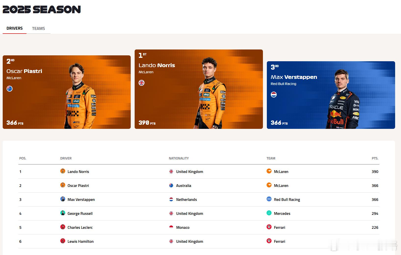 因为迈凯伦双车底板高度犯规取消成绩更新年度车手总积分后,VER和PIA暂平,和NOR就差24分所以余下两站比赛还真更有看头了