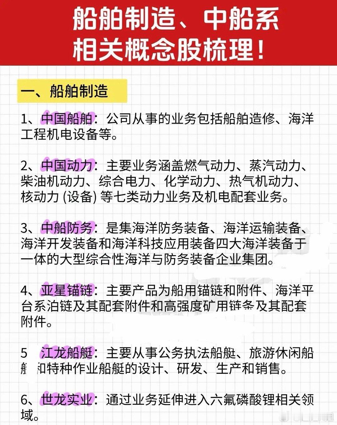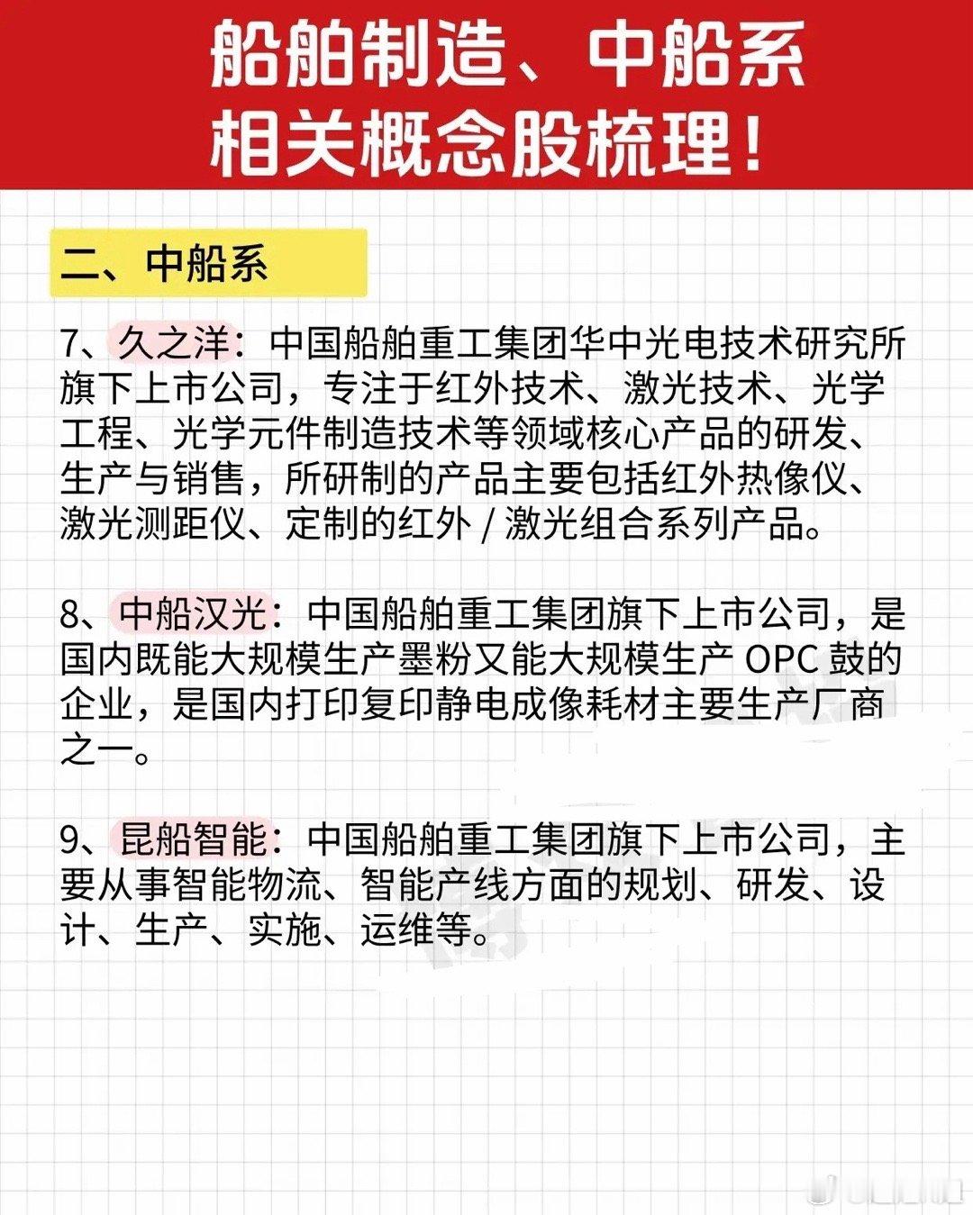 中国船舶产业链全梳理!两大巨头+10+核心股清单来了, 想看清船舶制造赛道?这篇直接划重点!🔥两大集团扛大旗:▪️中国船舶工业集团:中国船舶(全产业链龙头)、中船防务(华南军工船主力)、中船科技(高端工程设计)▪️中国船舶重工集团:中国动力(舰船7大动力全覆盖)、中船特气(国际级电子特气)、中国海防(电子信息核心)、久之洋(红外激光技术)🚢细分领域硬实力:• 造舰主力:中国船舶、中船防务(军用+民用全覆盖)• 动力心脏:中国动力(海军舰船动力主要研制商)• 配套王牌:亚星锚链(船用锚链龙头)、江龙船艇(公务/休闲船艇)、昆船智能(智能物流产线)• 新材料/电子:世龙实业(延伸六氟磷酸锂)、中船汉光(打印耗材规模级)从船舶制造到动力、电子、智能装备,完整产业链已配齐!你更看好哪个细分赛道?