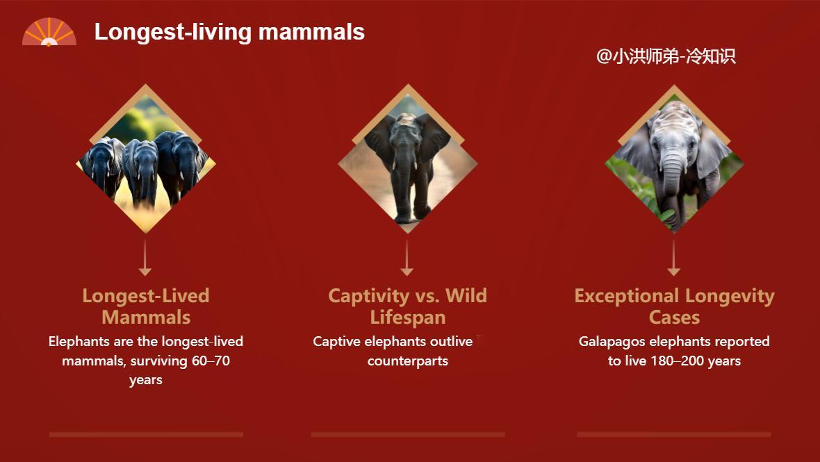 最长寿的哺乳动物大象在哺乳动物中是最长寿的,它能活60~70年,而人工饲养的大象比野生象寿命更长。曾经有报道称,一种生活在哥拉帕格斯群岛的长寿象能活上180~200年。||