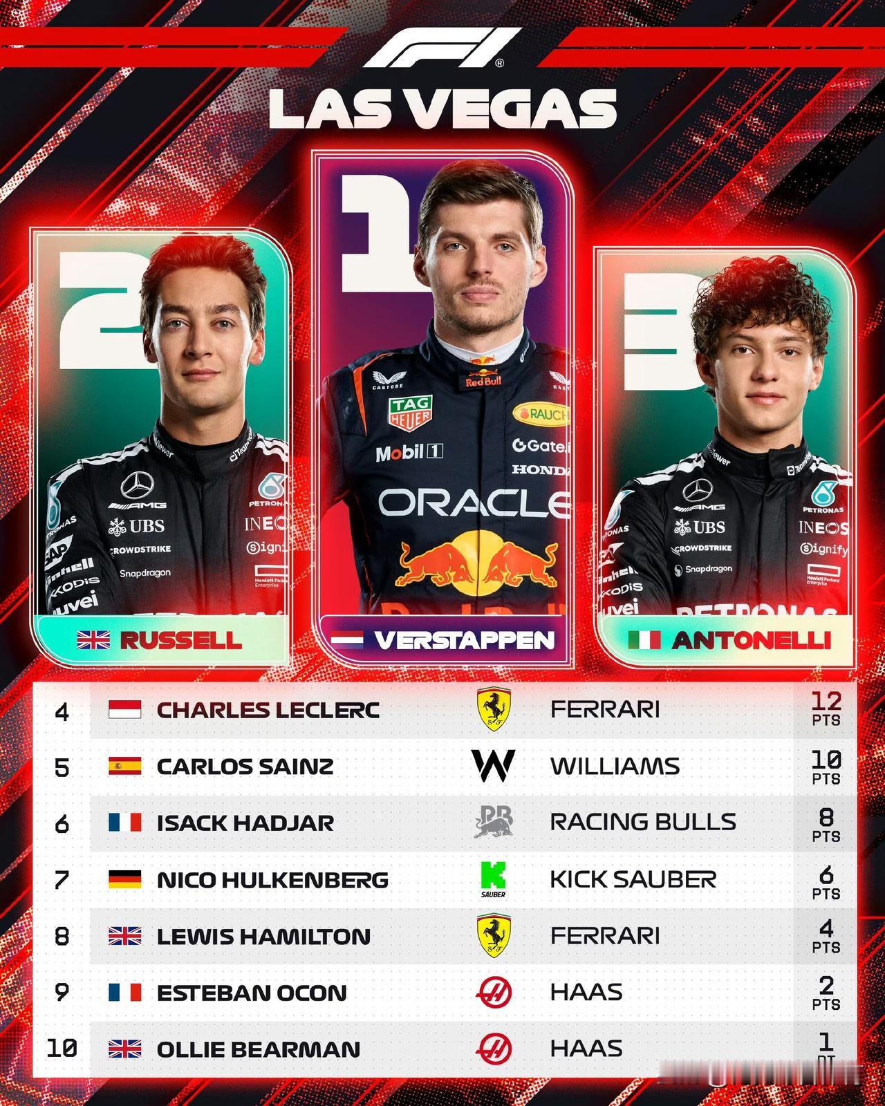 赛车:2025F1拉斯维加斯大奖赛正赛维斯塔潘夺冠! 迈凯伦车队两名车手被取消成绩,原因是两辆赛车尾部木板的厚度低于规则要求。 拉塞尔递补成为亚军!⬆️ 安东内利获得第三名!⬆️ 勒克莱尔升至第四!⬆️ 第五至第十分别为塞恩斯、哈贾尔、霍肯伯格、汉密尔顿、奥康、贝尔曼。
