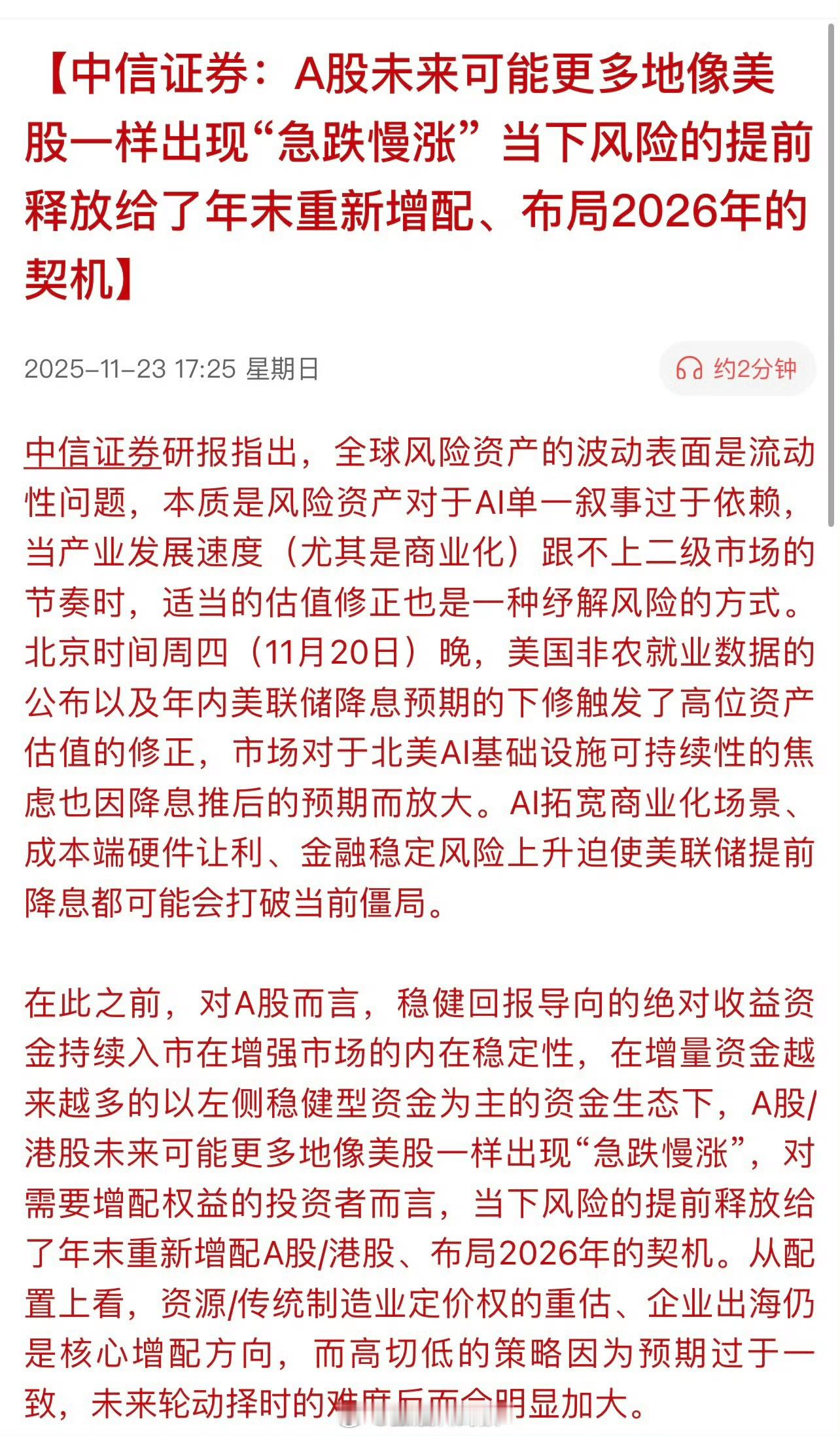 中信证券:A股未来可能更多地像美股一样出现“急跌慢涨”,当下风险的提前释放给了年末重新增配、布局2026年的契机