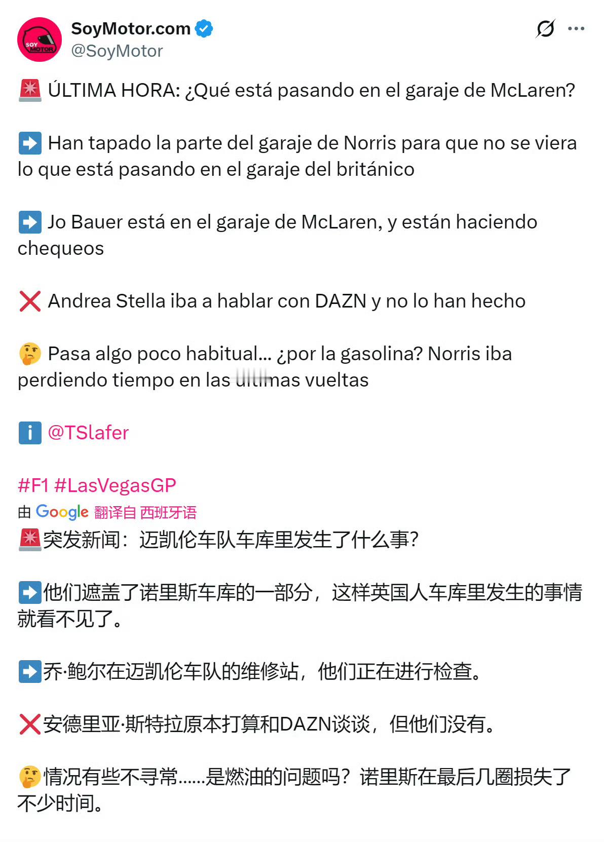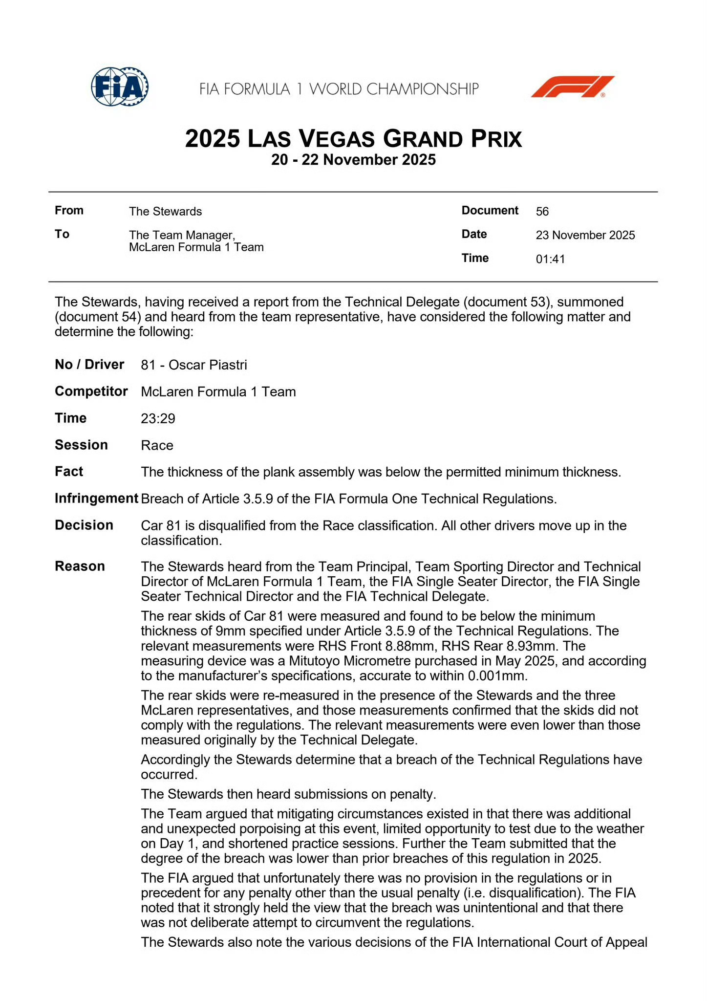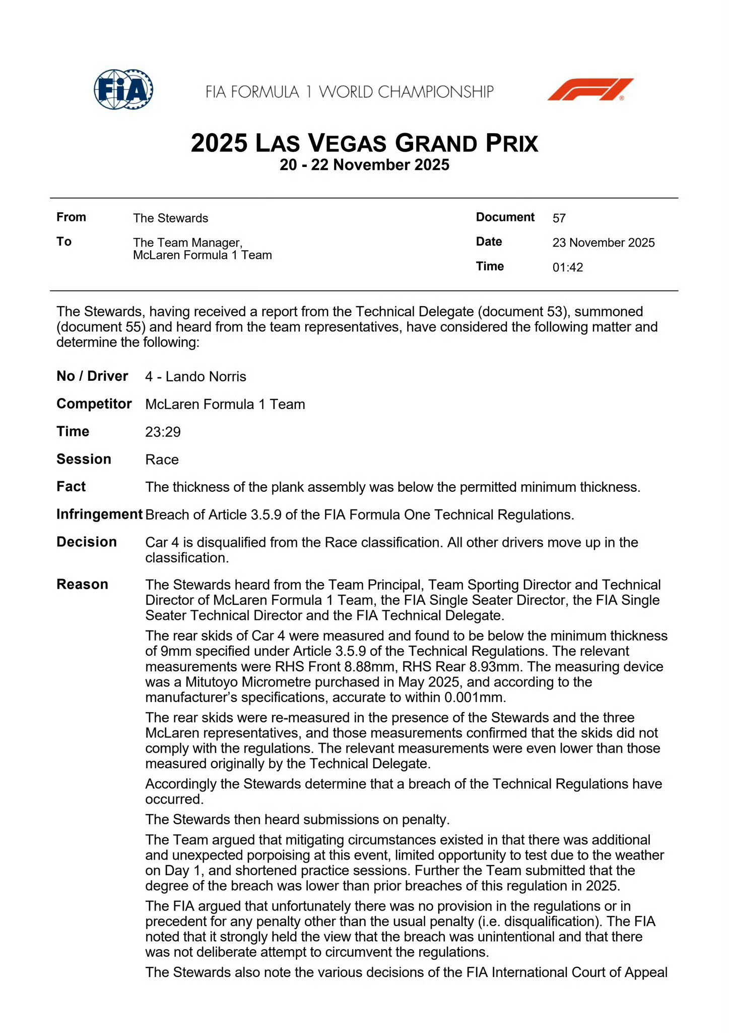 迈凯轮双车DSQ?! 木板厚度赛后检查没过,拉斯维加斯站积分全部取消。今年还有两站,潘子离开诺里斯只有24分,这F1赛后车检是比FSAE更刺激呀。