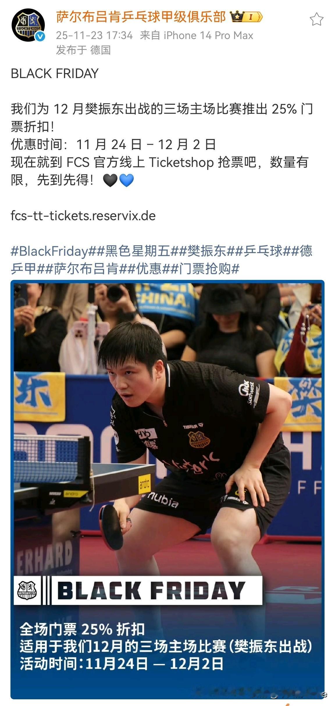11月23日,德国萨尔布吕肯乒乓球甲级俱乐部发文表示,樊振东在12月将出战3场比赛。 俱乐部为这三场主场比赛推出 25% 门票折扣,优惠时间为“11 月 24 日 – 12 月 2 日”。 樊振东人还没到,俱乐部已经开始先卖票了,这就是东东的影响力。 樊振东出国打球也是无奈之举,这样他才能保持竞技状态,这样才能为参加下一届奥运会做准备,大家觉得呢? 虽然我们不能飞往德国看他比赛,但我们依然可以为他加油打气,期待东东的12月德国之行。 我去考古了一下周雨的社交账号,看到几张他与东东的合照,分享给大家,那时的两人都好年轻呀,少年感扑面而来。
