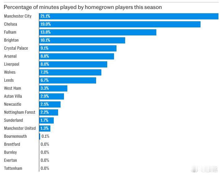 今晚北伦敦德比之前,阿森纳球迷又可以嘲笑一下邻居热刺了。每日电讯报做了一个统计表,本赛季英超联赛,给予本土本俱乐部球员出场时间比例排名,阿森纳排第六,热刺倒数第一。曼城第一,切尔西第二。所谓的本土球员,就是15岁到21岁之间,本俱乐部是该球员加盟的第一家俱乐部,这样的球员被认为是本土青训球员,倒不一定限制国籍。阿森纳阵容中有萨卡、恩瓦内里、斯凯利,以及小将道曼。热刺可能只有一个斯嘉丽,穆里尼奥时期硬拔出来的,但今晚未必进入比赛大名单。必须承认,近年来热刺的青训远远落后于伦敦邻居阿森纳、切尔西,更没法跟曼城比。斯宾塞是从米堡买来的,如果今晚首发的左后卫是乌多吉,热刺首发甚至一个英国人都没有。阿森纳首发可能有四个英格兰球员,萨卡、莱斯、艾泽、斯凯利。