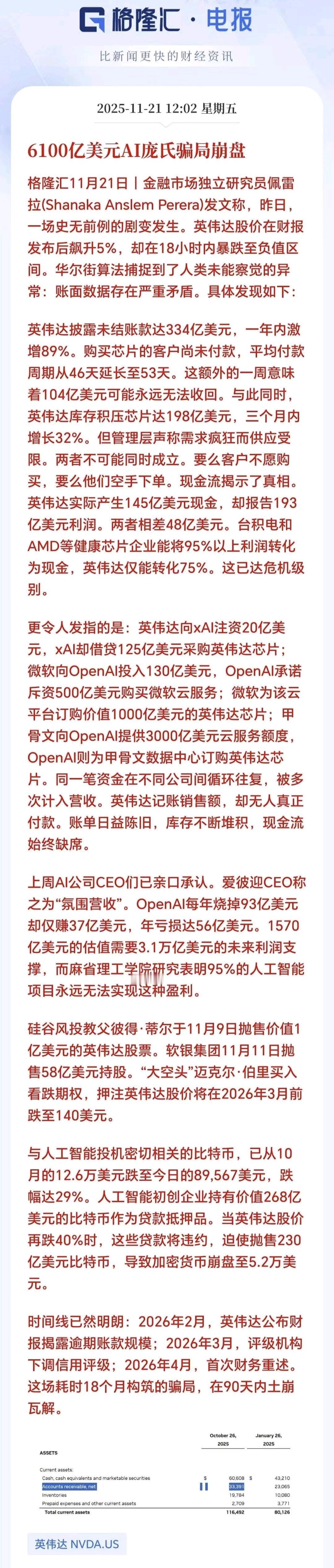 6100亿AI惊天骗局曝光! 英伟达股价狂泻,334亿账款难收回,资本纷纷抛售引震荡! 美国那边大规模搞AI就是个笑话, 首先能源电力供给就不足, 还有通信基础建设等全面落后中国, 美国华尔街资本玩弄金融, 造成美国制造业产业空心化,咎由自取。 而英伟达需要中国市场,可川普不允许。 AI的泡沫还会继续一段时间,毕竟那么多大公司在里面,左脚踩右脚不断上天,只是挺危险的,一个不慎就是全球规模的金融海啸。英伟达公司 英伟达AI 英伟达市值下降 英伟达股价行情