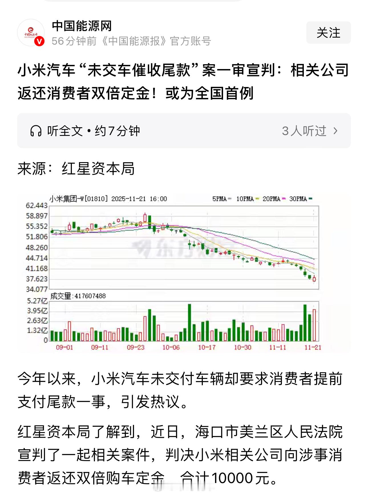 小米“未交车催收尾款”案一审宣判来了,车主胜诉!小米相关公司向涉事消费者返还双倍购车定金,合计10000元。