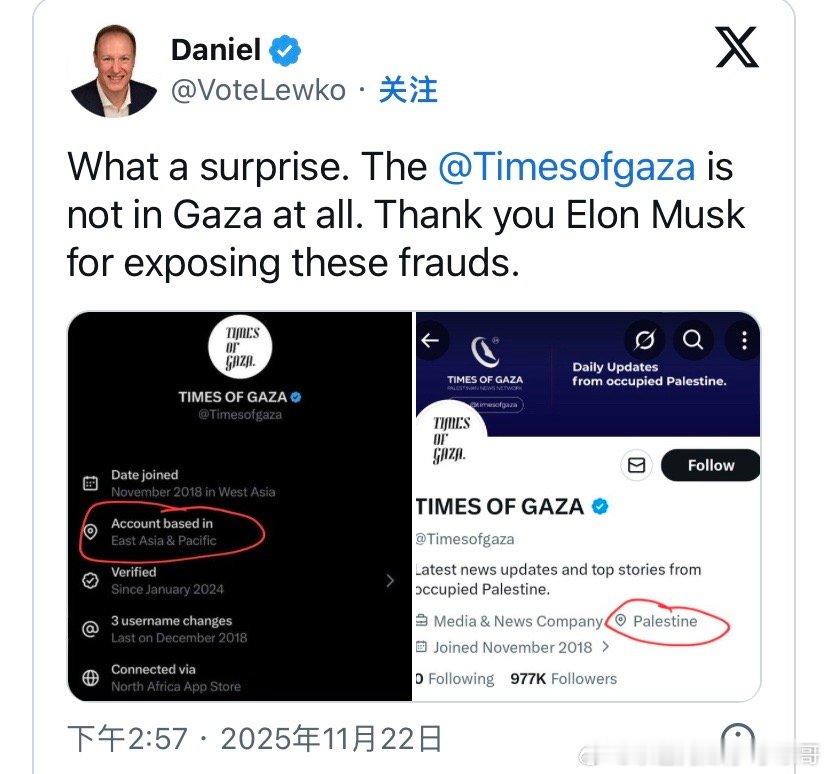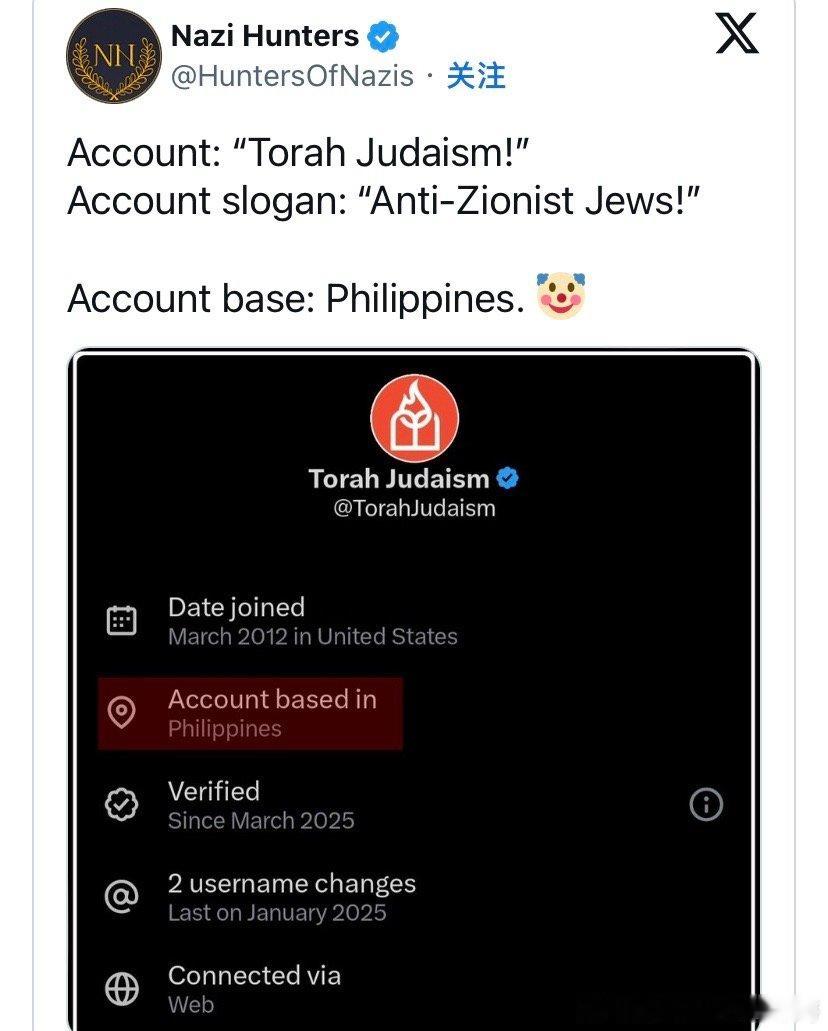 暴露了推特最近上线一个功能,可以查看用户IP地址以及创建最初的地址和更改痕迹。结果很多加沙战争期间大骂以色列的所谓“加沙老百姓”都暴露了,原来他们都在外国。所谓的“加沙时报”,定位竟然在东亚。 一个自称以色列的反犹主义的犹太人结果IP是菲律宾。还有很多有趣的例子:一个“生活在空袭下拉法”的巴勒斯坦账户IP显示来自阿富汗。一名“汗尤尼斯护士”显示结果身在巴基斯坦。一名冒充“北加沙幸存者”的用户实际上也在巴基斯坦。还有一名自称“拉法居民”的账户其实在印度尼西亚。甚至冒充以色列国防军士兵来反对内塔尼亚胡的人,结果发现IP在伦敦。