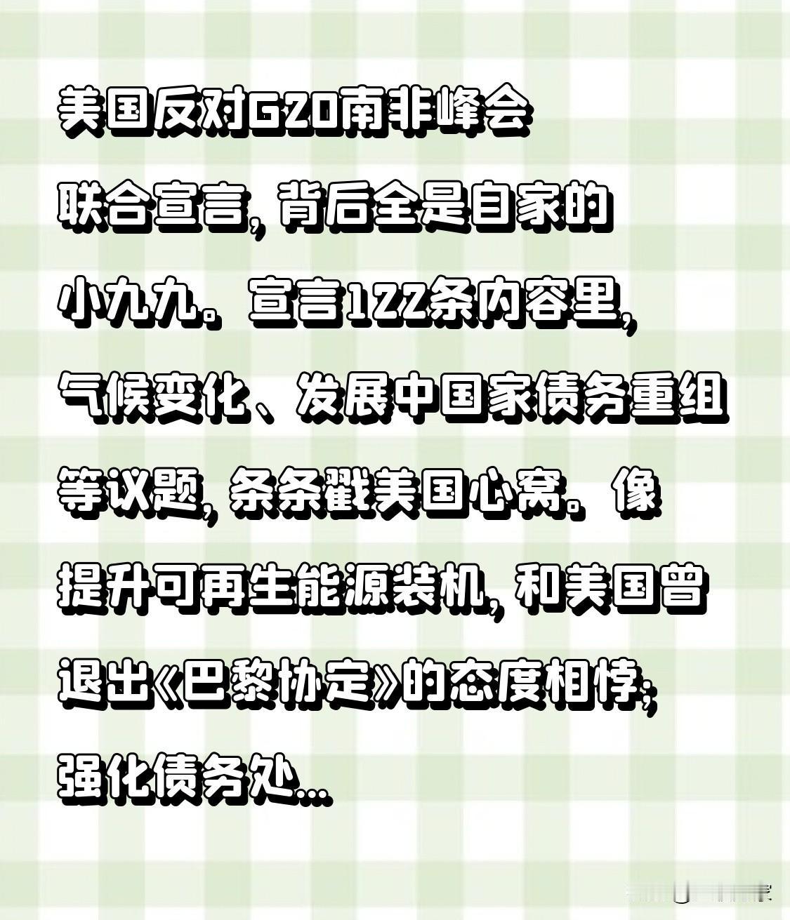 美国反对G20南非峰会联合宣言,背后全是自家的小九九。宣言122条内容里,气候变化、发展中国家债务重组等议题,条条戳美国心窝。像提升可再生能源装机,和美国曾退出《巴黎协定》的态度相悖;强化债务处理机制,更是动了美国靠美元霸权“躺赚”的奶酪。 南非起诉以色列“种族灭绝”得罪美国,美国便借反对宣言报复。而且这次峰会在非洲举办,南非让全球南方的诉求纳入宣言,美国忌惮新兴力量崛起,怕自己影响力被稀释。另外,美国正值大选关键期,反对宣言也是为了服务国内选举。美国这是妥妥的霸权焦虑,上演“逆潮流”闹剧! g20巴西峰会 ccac峰会 g20峰会 g20巴西峰会 南非g20 南非 南非关系 南非争端 南非出重拳