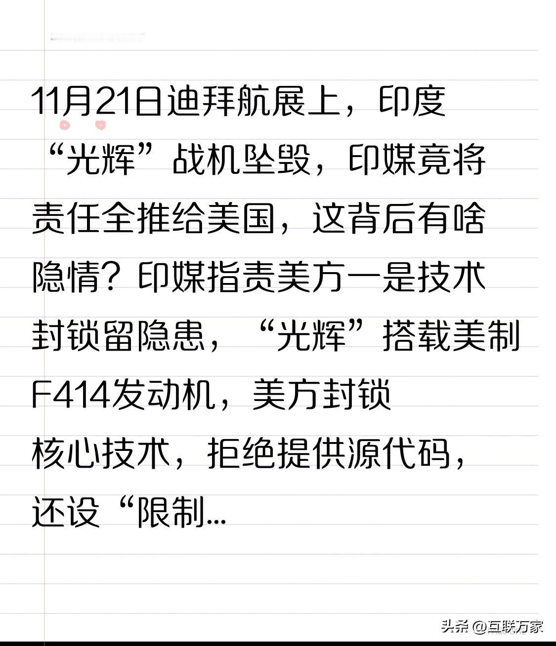 11月21日迪拜航展上,印度“光辉”战机坠毁,印媒竟将责任全推给美国,这背后有啥隐情? 印媒指责美方一是技术封锁留隐患,“光辉”搭载美制F414发动机,美方封锁核心技术,拒绝提供源代码,还设“限制程序”,航展特技触发后发动机动力骤降。且此前空军报告也指出发动机有高压涡轮叶片磨损快等问题。二是拖延交付影响维护,此前采购F404发动机就有波折,美方恢复产能慢,交付效率低,影响战机部署和维护。 印媒把锅全甩给美国,是真的美国问题,还是印度自身也有原因?“光辉”战机后续发展会怎样?印美之间的合作又会受何影响? 美坠毁客机 印度航空坠机 印度坠机 波音坠机 印度战机被毁 印度坠毁事故 光辉飞机 印度坠机 印度阵风坠机 印度航展踩踏 印度坠毁飞机