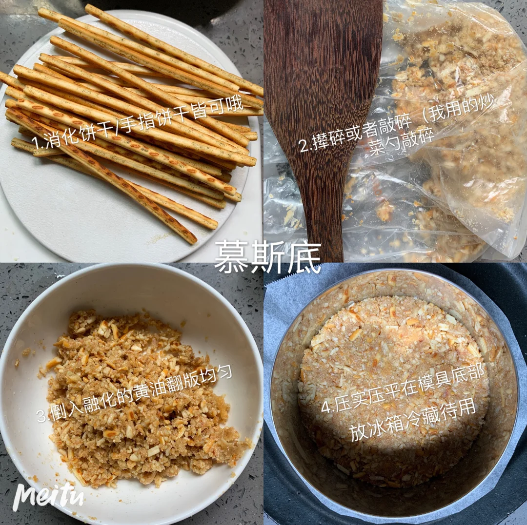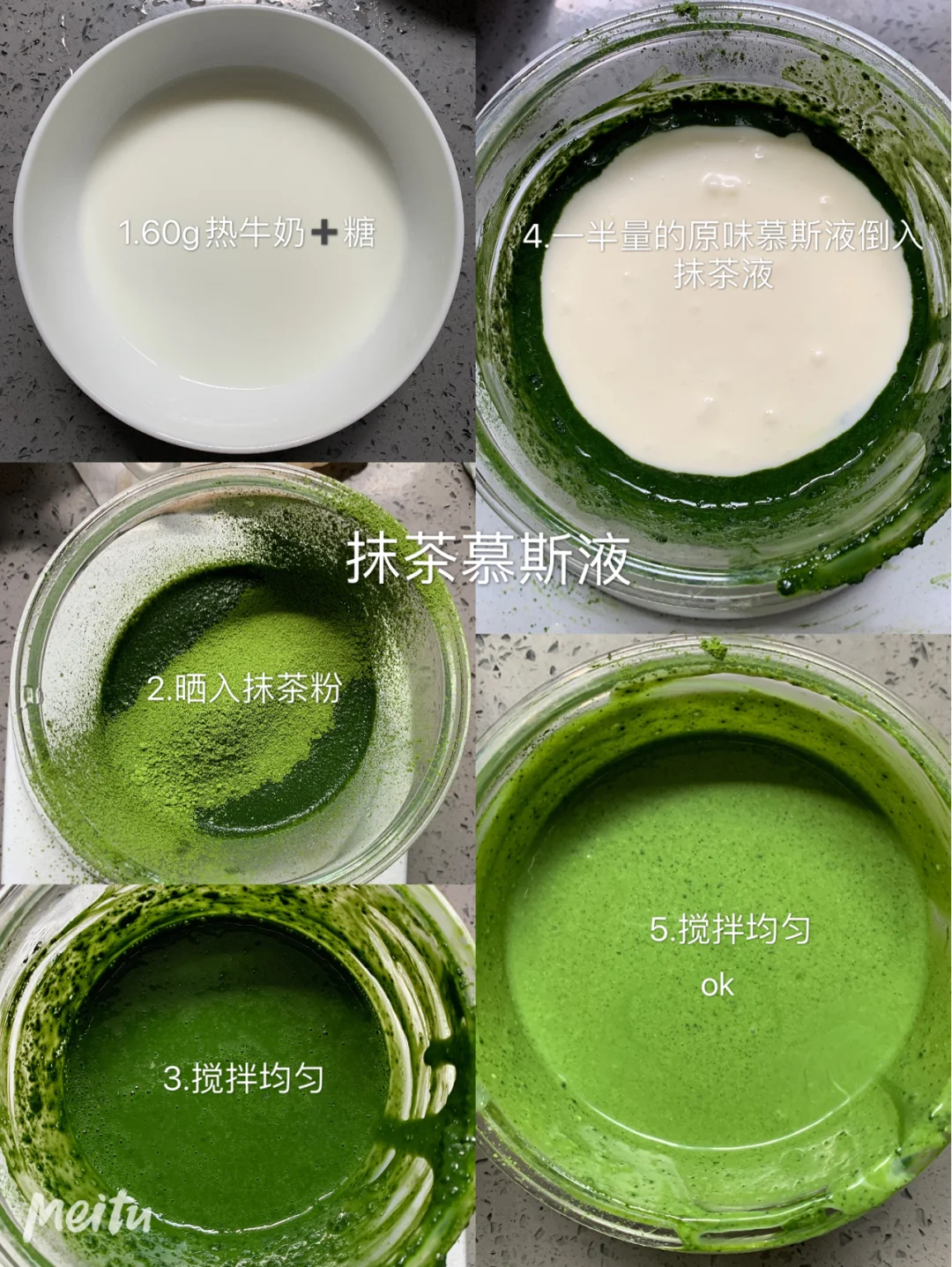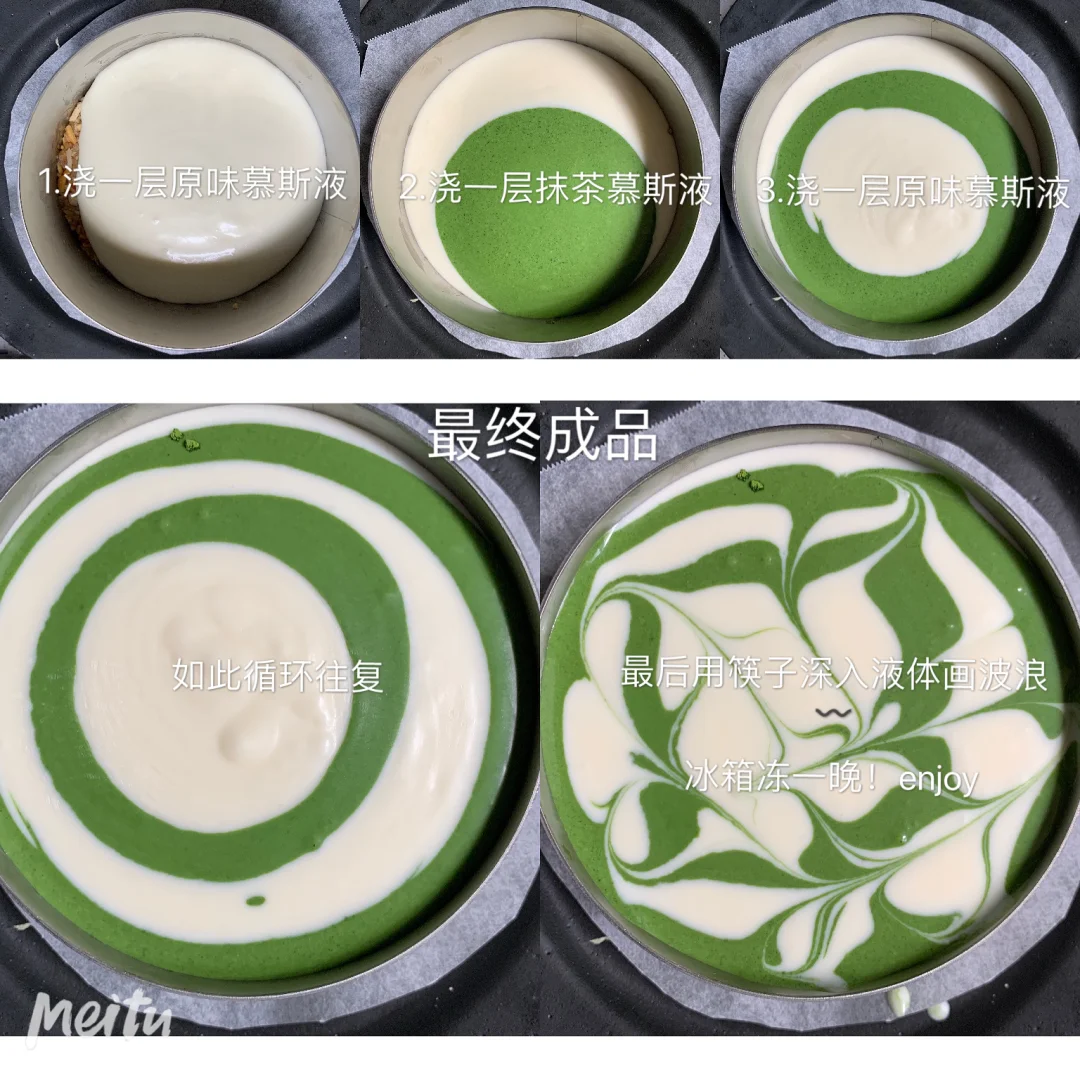 1.饼干底,2.原味慕斯,3.抹茶慕斯