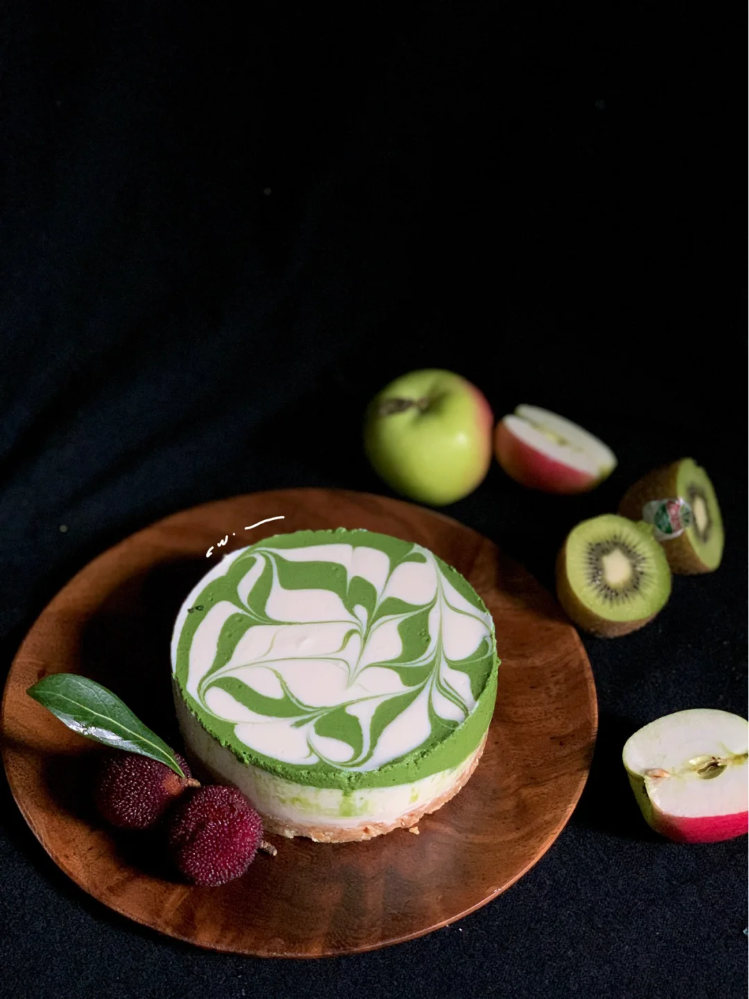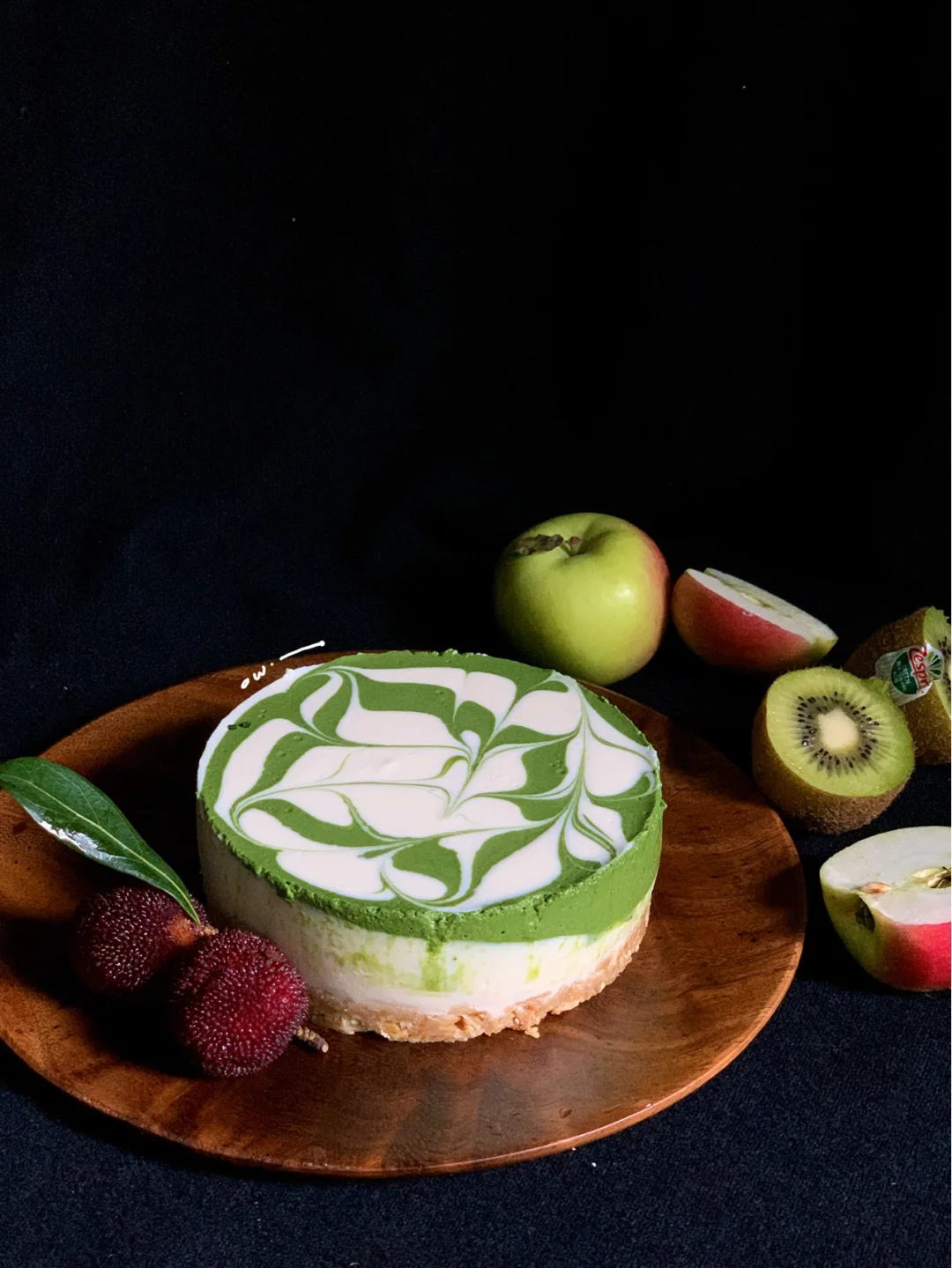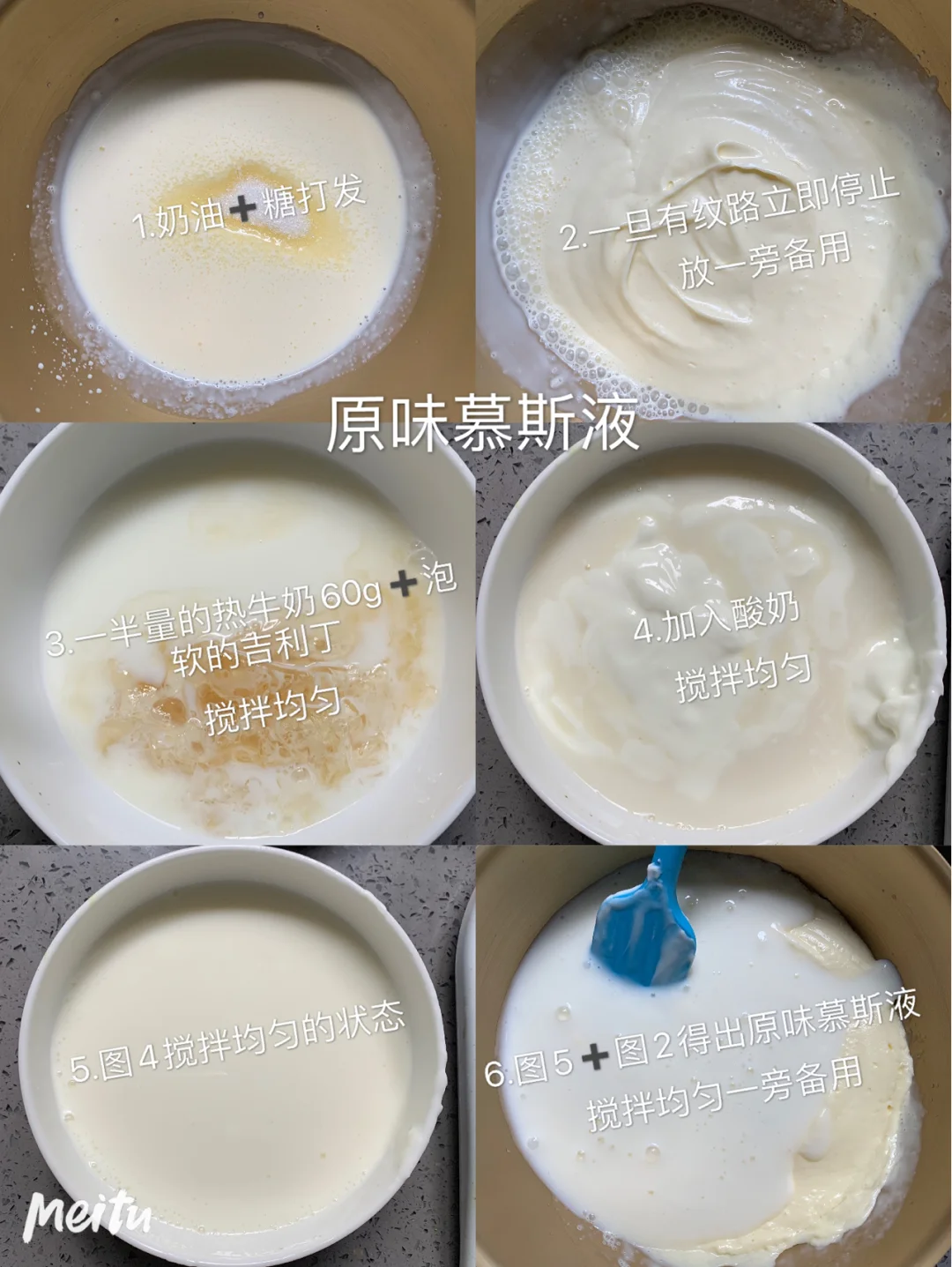 1.饼干底,2.原味慕斯,3.抹茶慕斯