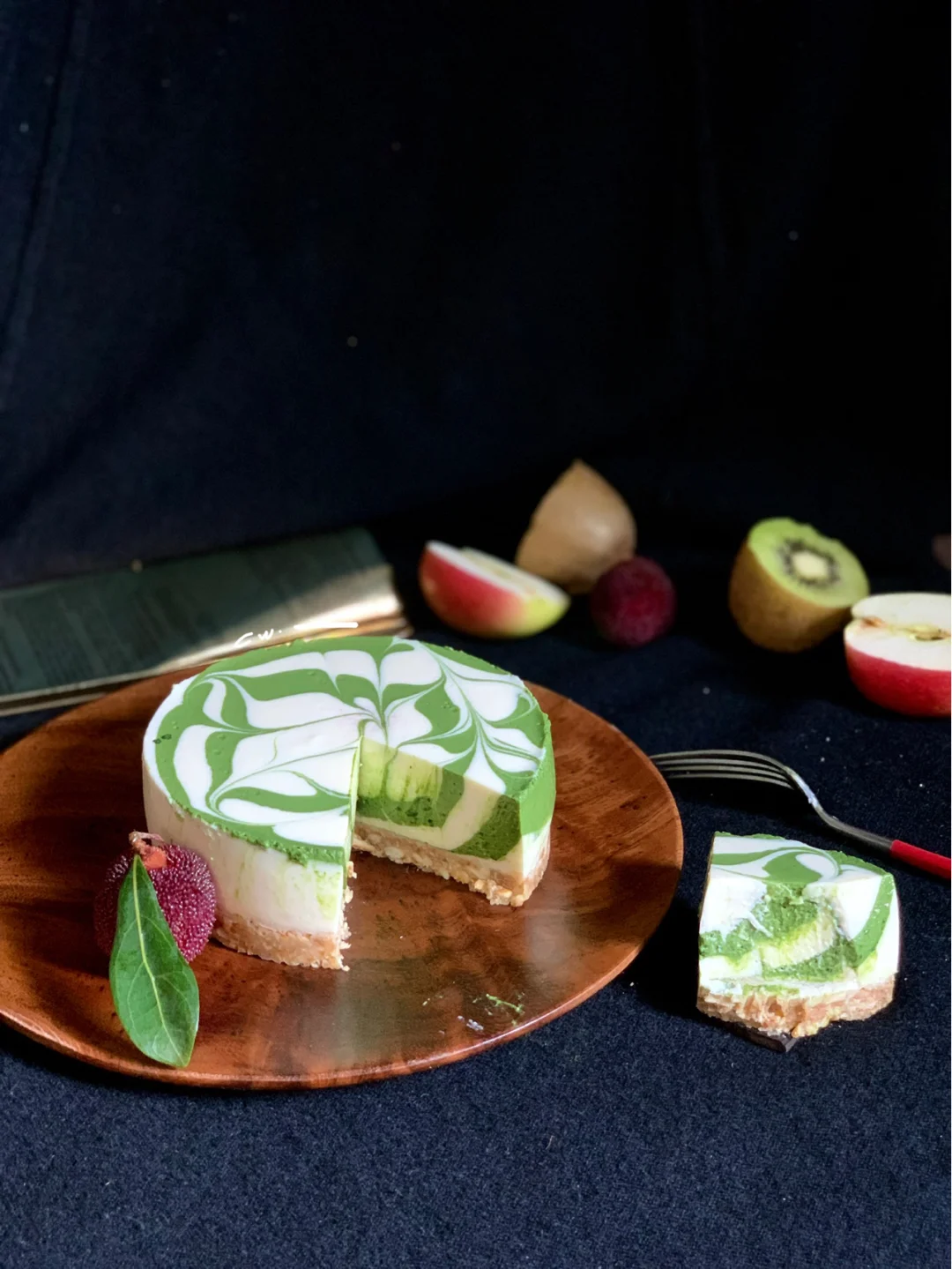 最后,冰箱里的模具拿出,倒一层原味慕斯,一层抹茶慕斯一层原味慕斯一层抹茶慕斯,如此循环,最后用筷子画波浪〰️状出现大理石纹理,冰箱冷藏一晚~ok