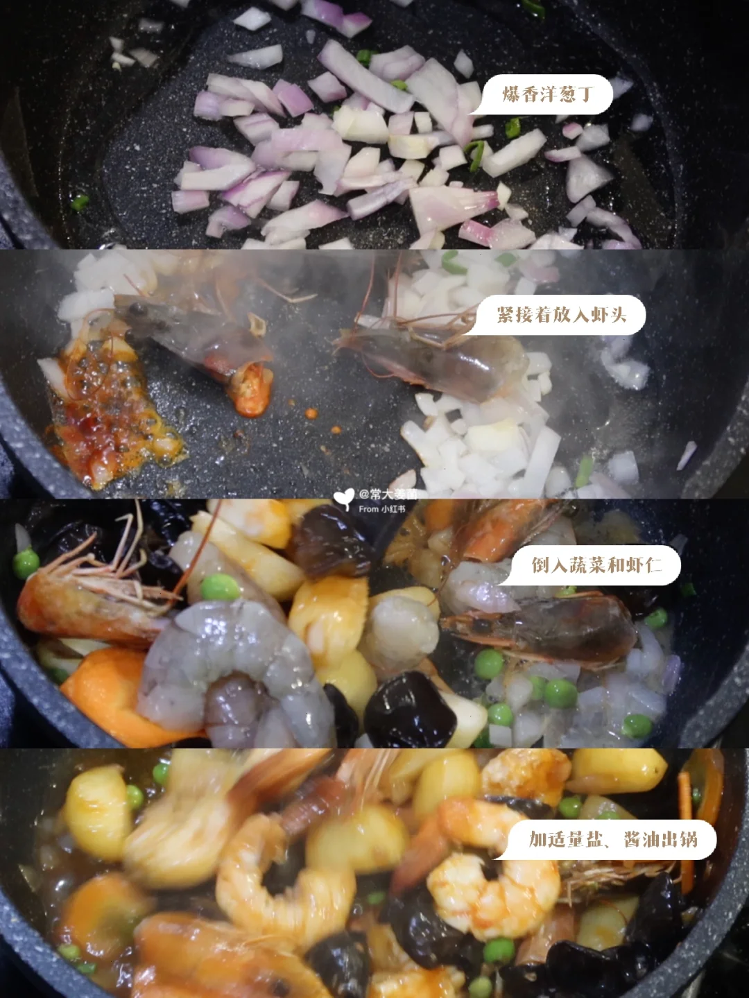 步骤:爆香蒜葱➕虾头👉🏻所有食材倒入翻炒至熟👉🏻耗油上色,出锅。