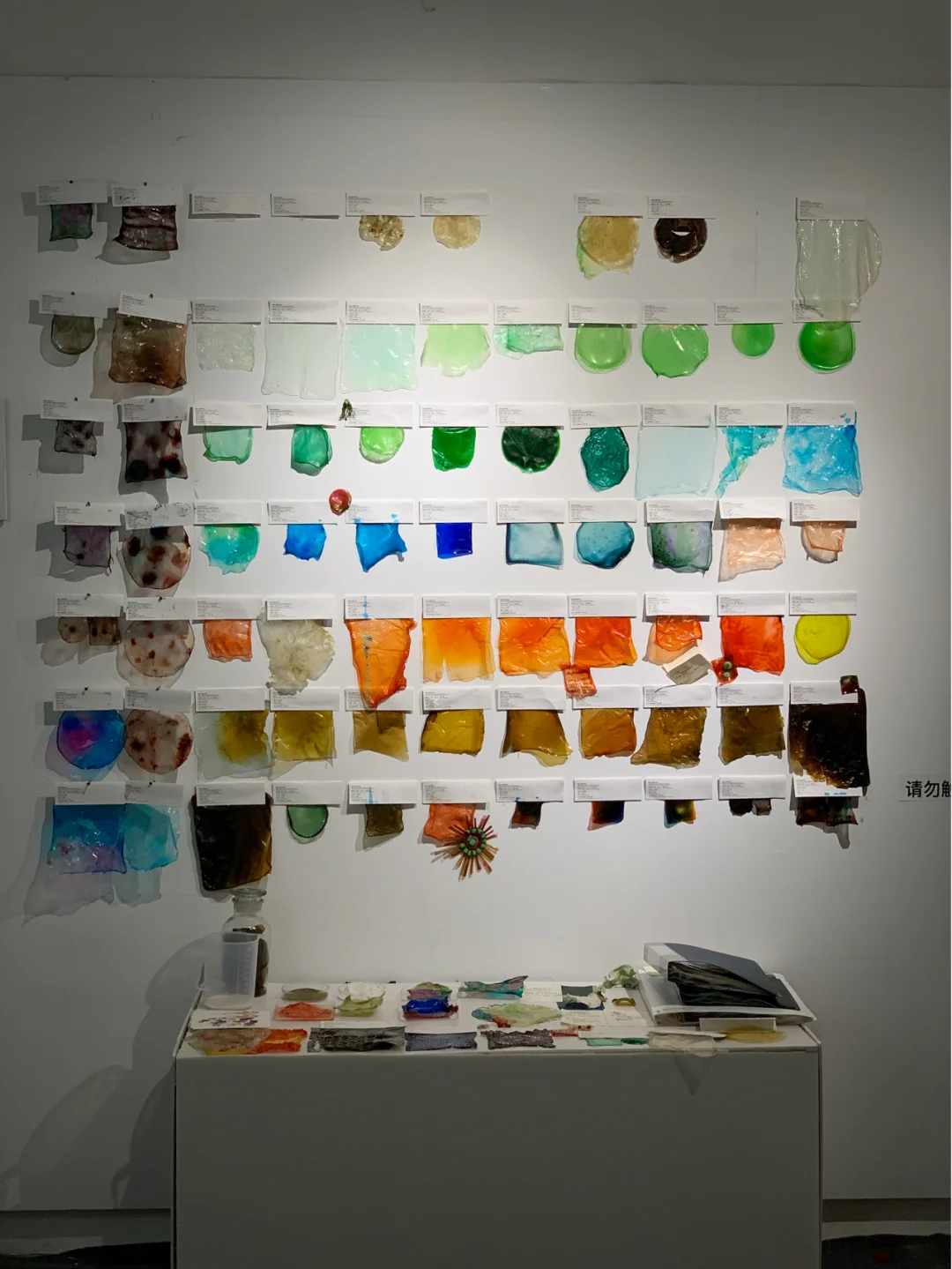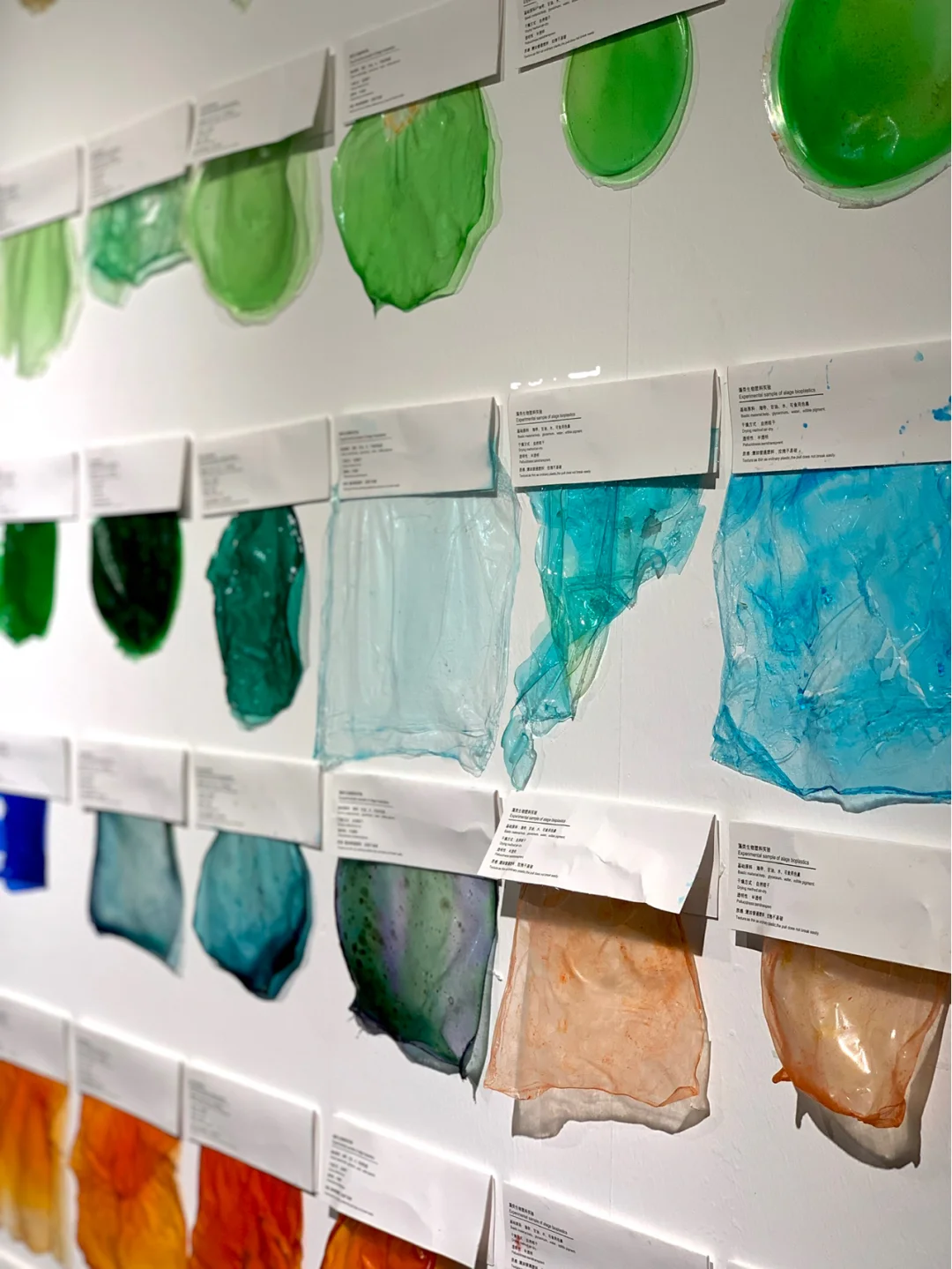 作者将自身专业技艺➕艺术化的思想注入生物塑料中进行了一系列面料实验。这些高颜清新的实验作品可以作为一次性塑料的代替品,以此呼吁更多的人重视塑料污染问题,引起大家对生物塑料的注意。