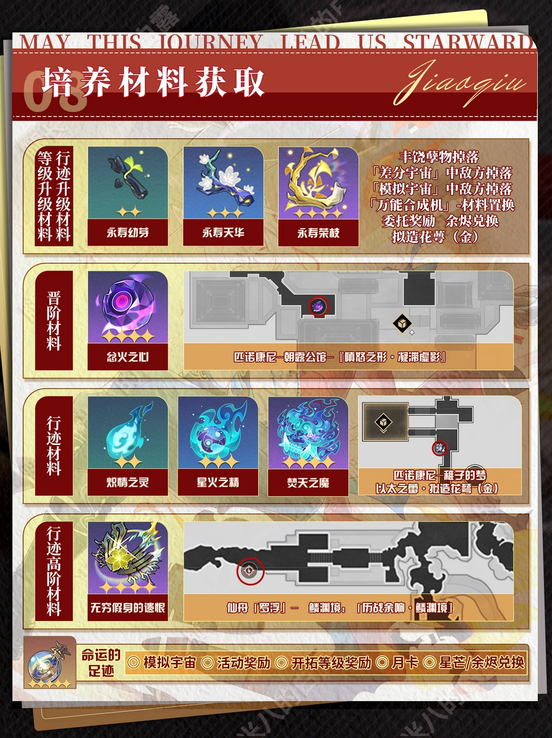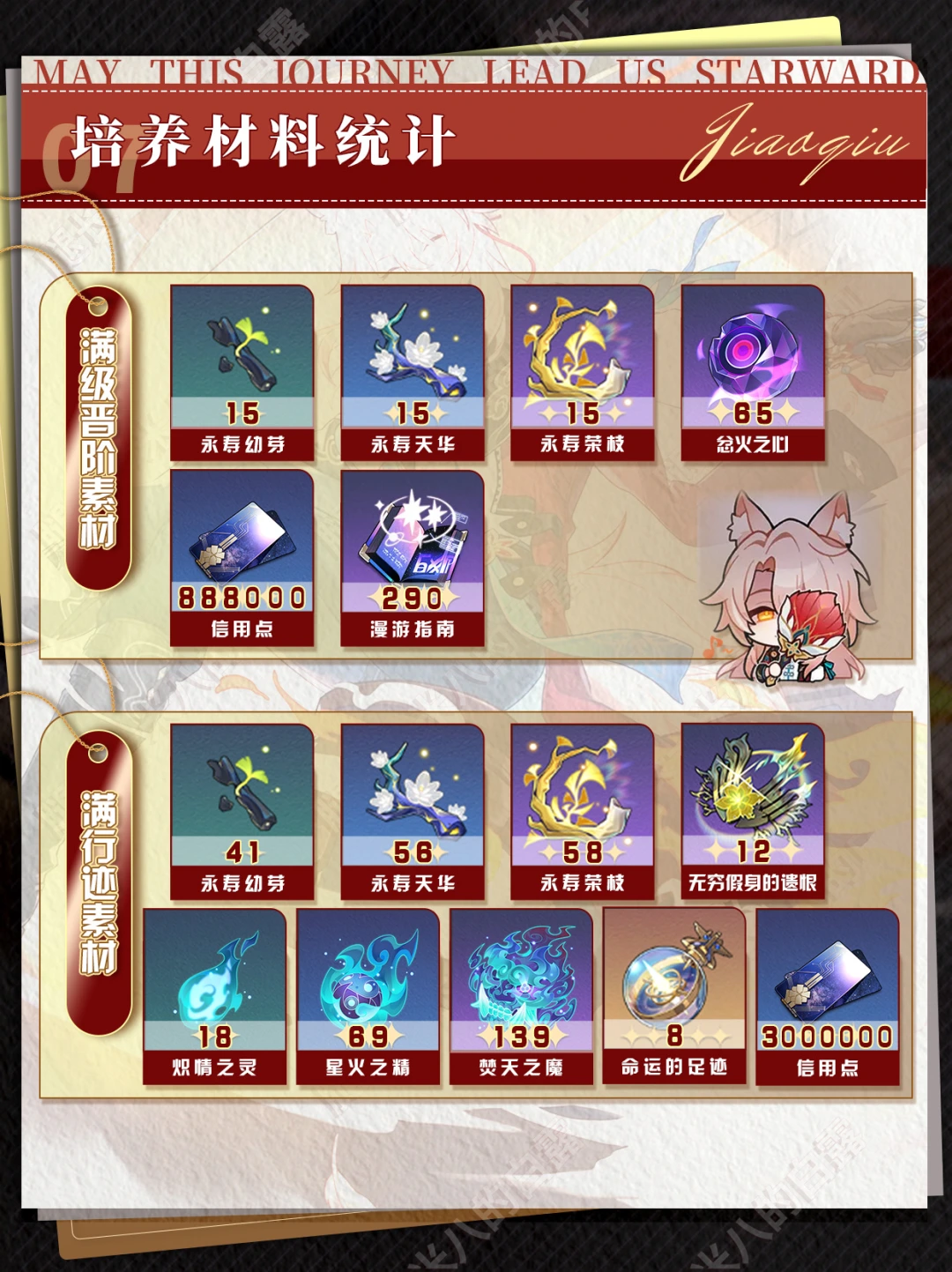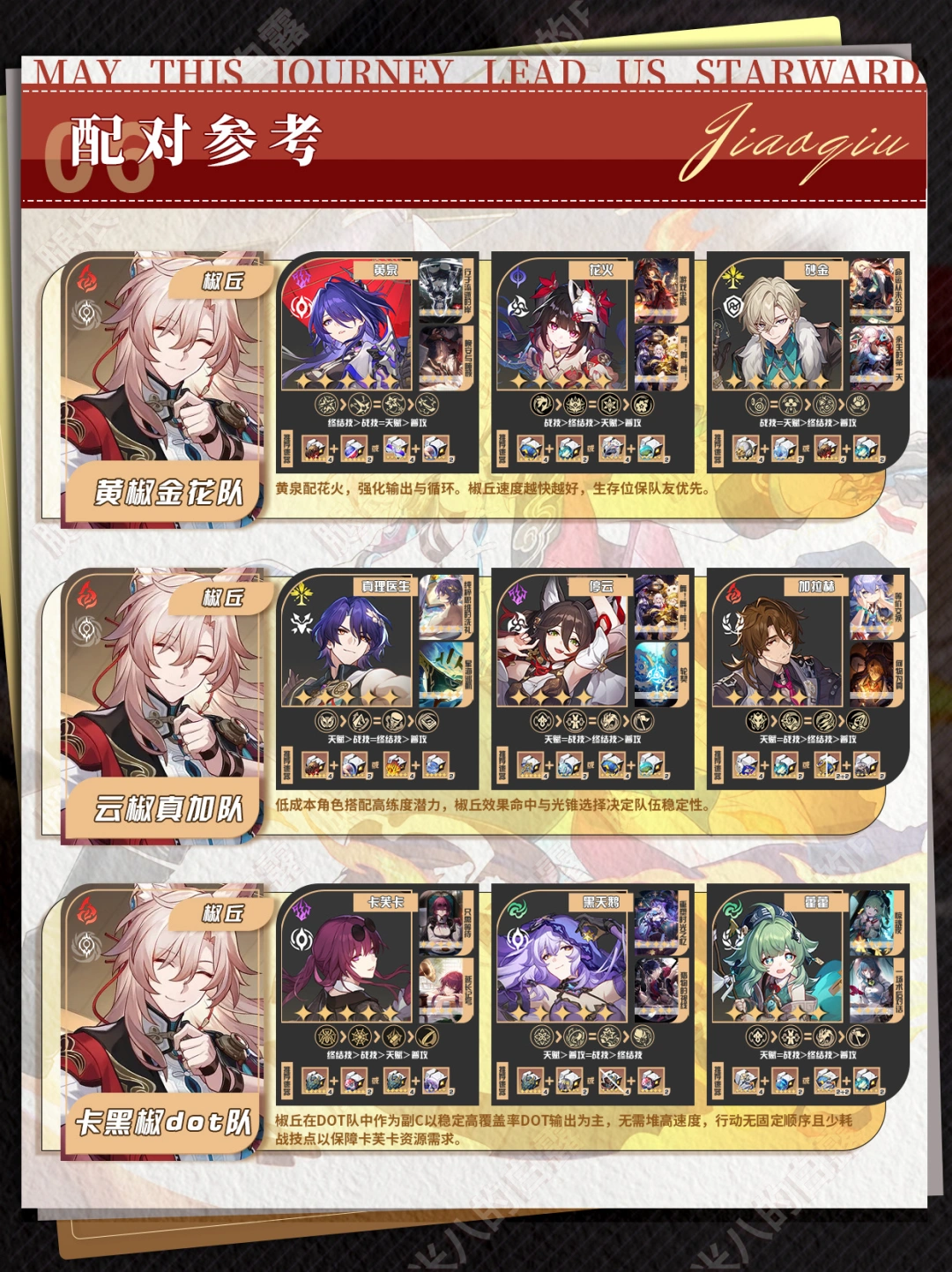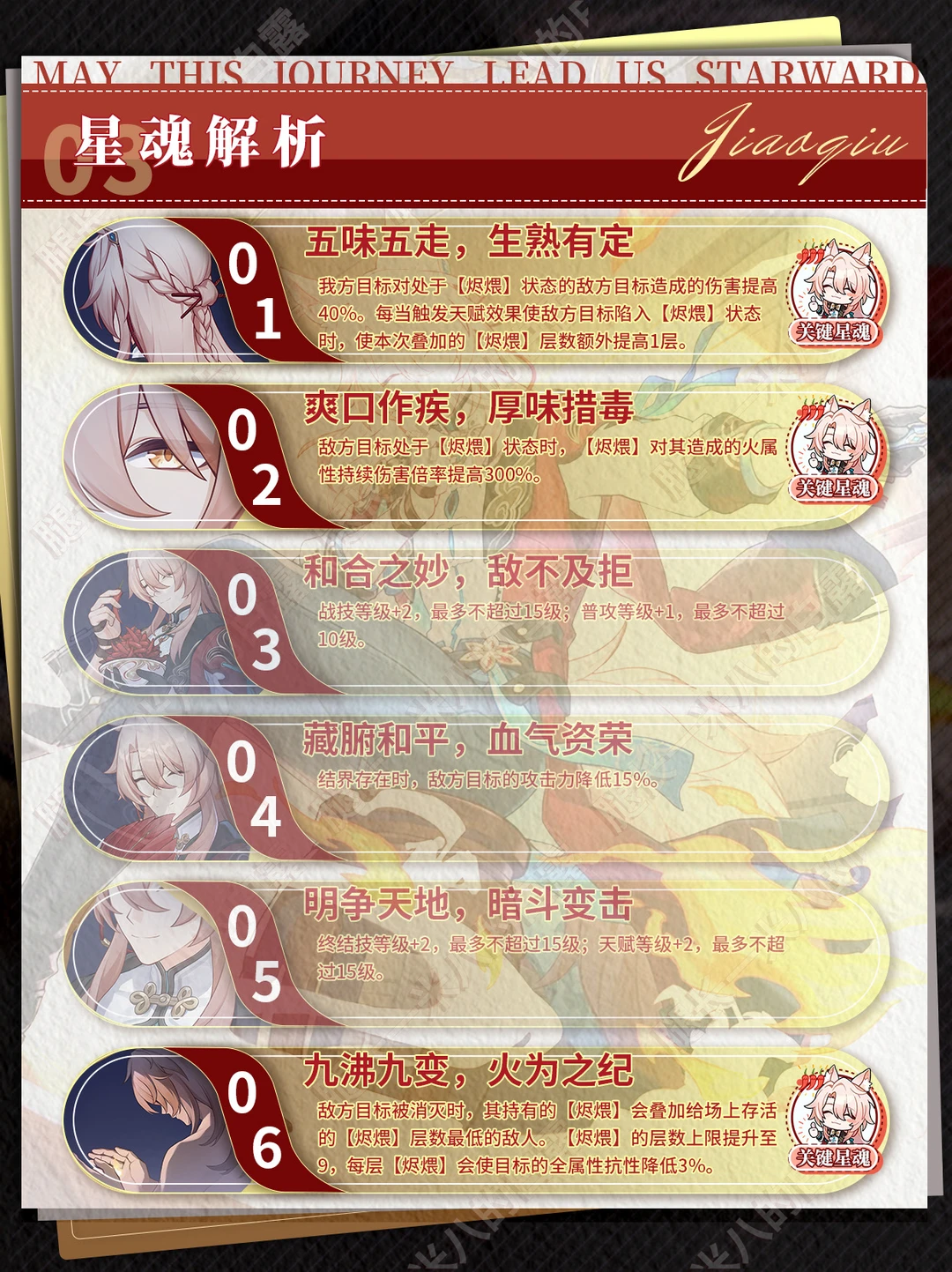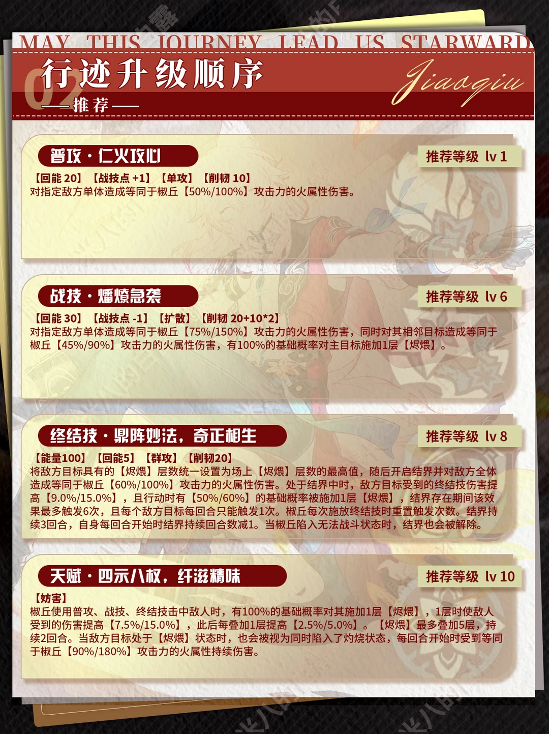 椒丘使用普攻、战技、终结技击中敌人时,有100%的基础概率对其施加1层【烬煨】,1层时使敌人受到的伤害提高【7.5%/15.0%】,此后每叠加1层提高【2.5%/5.0%】。【烬煨】最多叠加5层,持续2回合。当敌方目标处于【烬煨】状态时,也会被视为同时陷入了灼烧状态,每回合开始时受到等同于椒丘【90%/180%】攻击力的火属性持续伤害。
