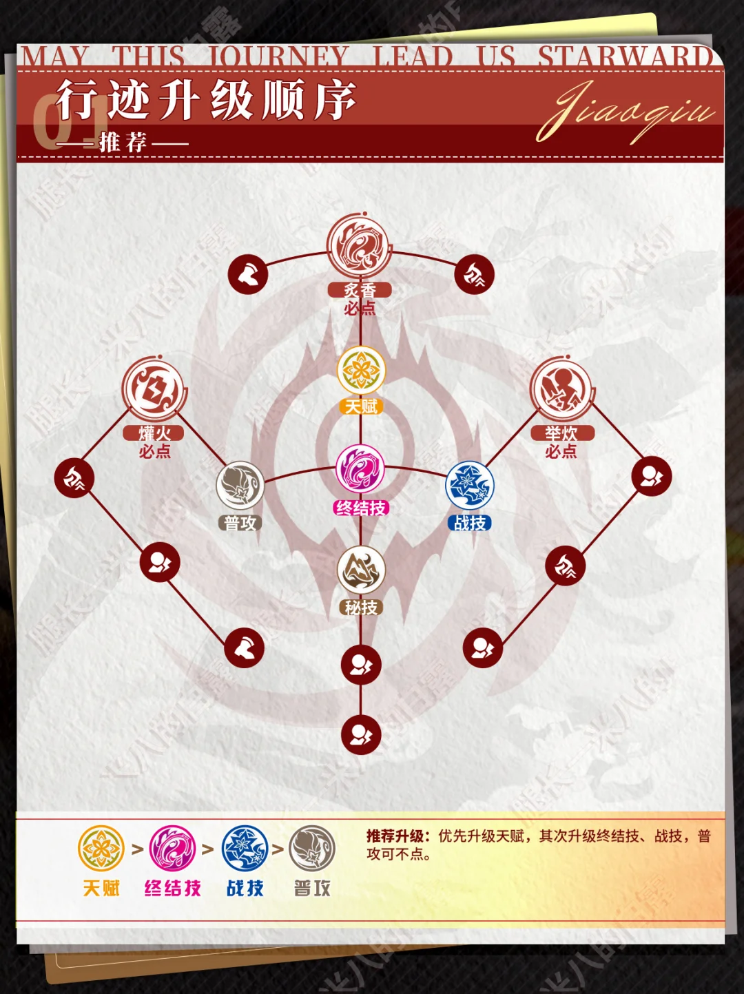 推荐升级:优先升级天赋,其次升级终结技、战技,普攻可不点。