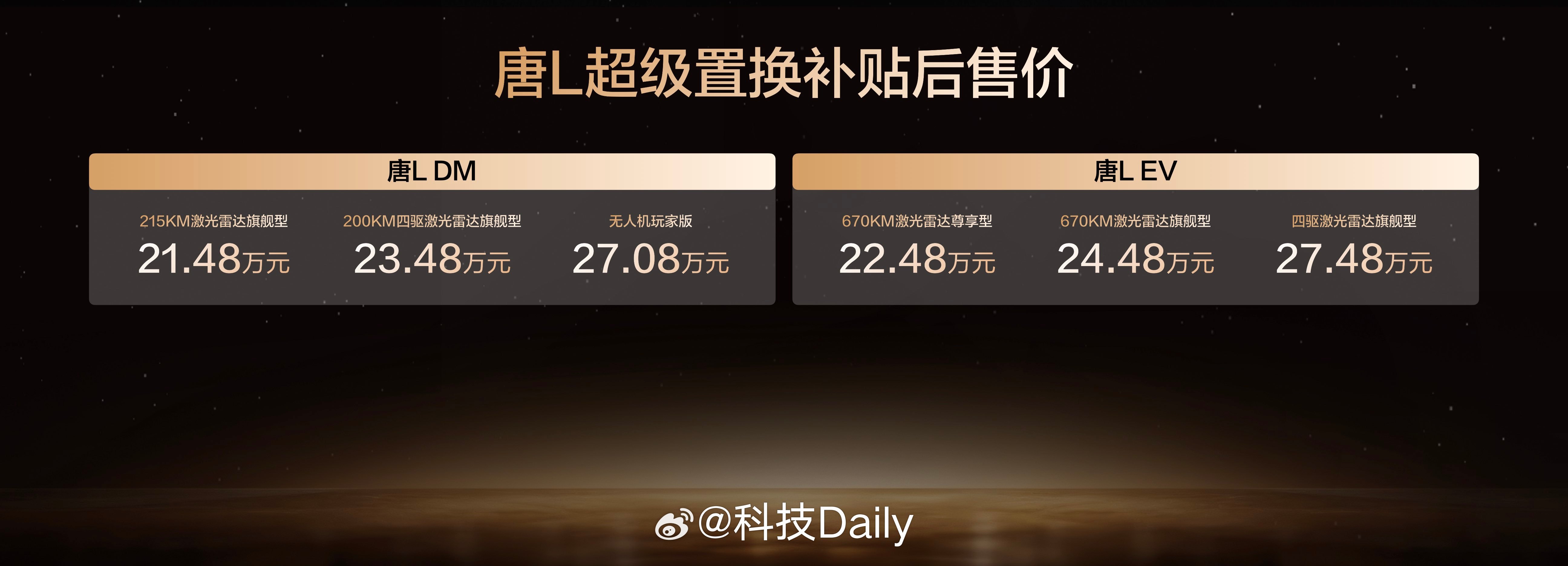 2025广州车展看比亚迪唐L,超级e平台全域千伏架构,兆瓦闪充 油电同速;更有唐L DM标配第五代DM技术,兼顾超强性能与超级效能。车展上新色,直接看实车!这次唐L EV 3款车型,补贴后售价22.48万~27.48万元;唐L DM 3款车型,补贴后售价21.48万~27.08万元。先看唐L EV全系标配超级e平台,峰值充电功率高达1000kW,仅需5分钟即可补充370公里续航,充电超级快!580kW单电机功率,四驱版本总马力达1102匹,实测百公里加速最快仅3.6s,极速达287km/h以上,速度拉满。相对的混动版本,唐L DM搭载第五代DM技术,唐L DM零百加速仅需4.3秒,百公里亏电油耗最低仅4.9升,纯电续航足足215km,带来了1430km综合续航。颜值设计中,唐L特别推出橄榄绿全新车色,并将汉L上备受好评的琉光银配色向唐L用户开放选装,颜值超高。智能化进阶表现中,唐L智能座舱与辅助驾驶系统皆带来全新OTA升级,全系标配的智能座舱高阶版-DiLink 150实现了从视觉到交互的全面焕新,非常适合车展体验。广州车展看实车,感受新颜值,新技术,新实力,比亚迪唐L值得一看更值得一买,推荐大家选择起来。