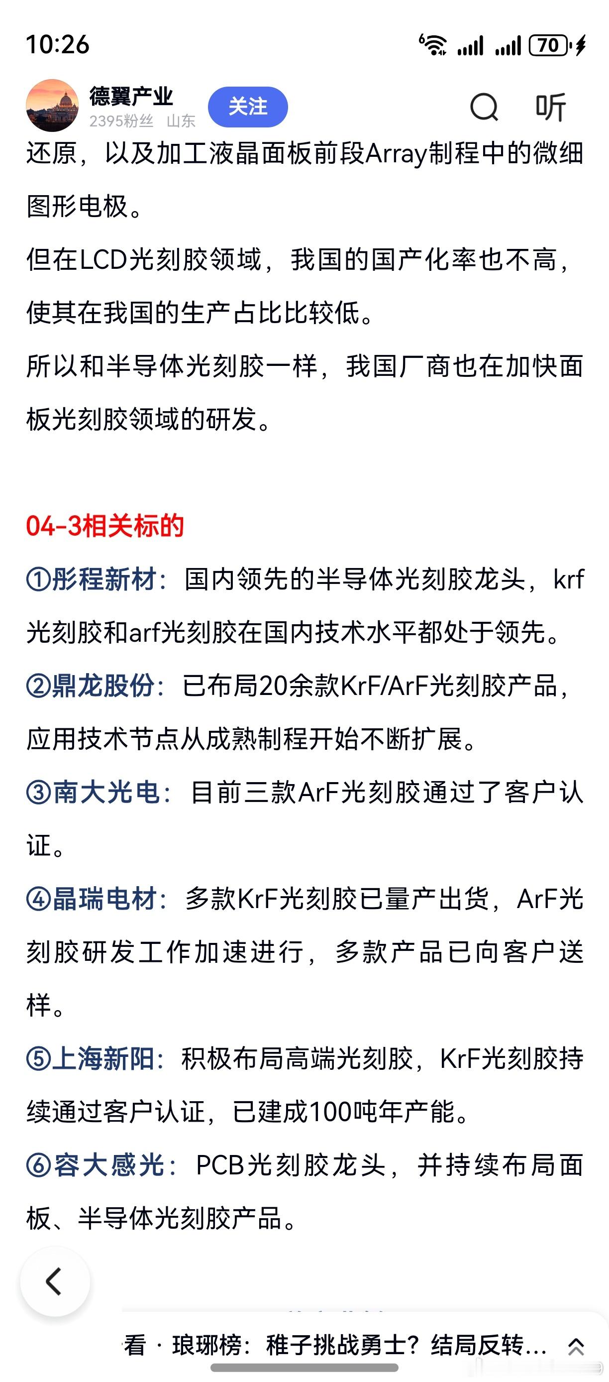 老鸭本周盈利的,只有光刻胶概念股。彤程新材是短线投机一把,考虑到同板块个股仓位太重,周四冲高就卖。如果留到周五,老鸭周五是可以盈利的。股市里的事,就是这么说不清道不明。替代东边邻居概念,看看后市走势。仅作操作回顾,并摘录过去的不专业资料作个分享,不作任何荐股!