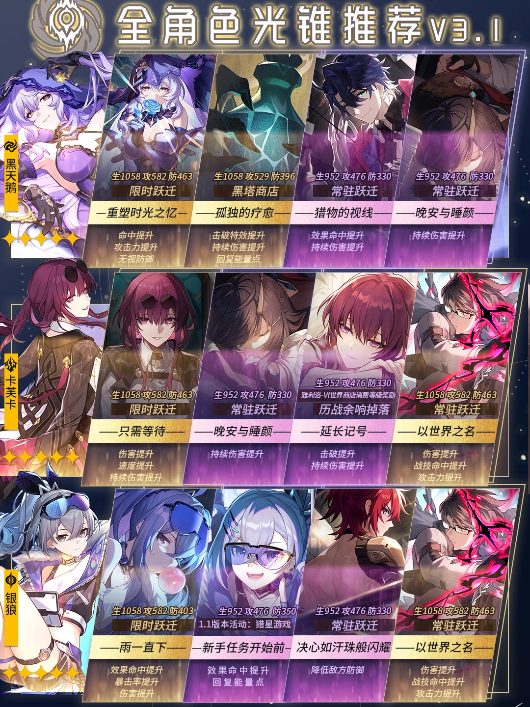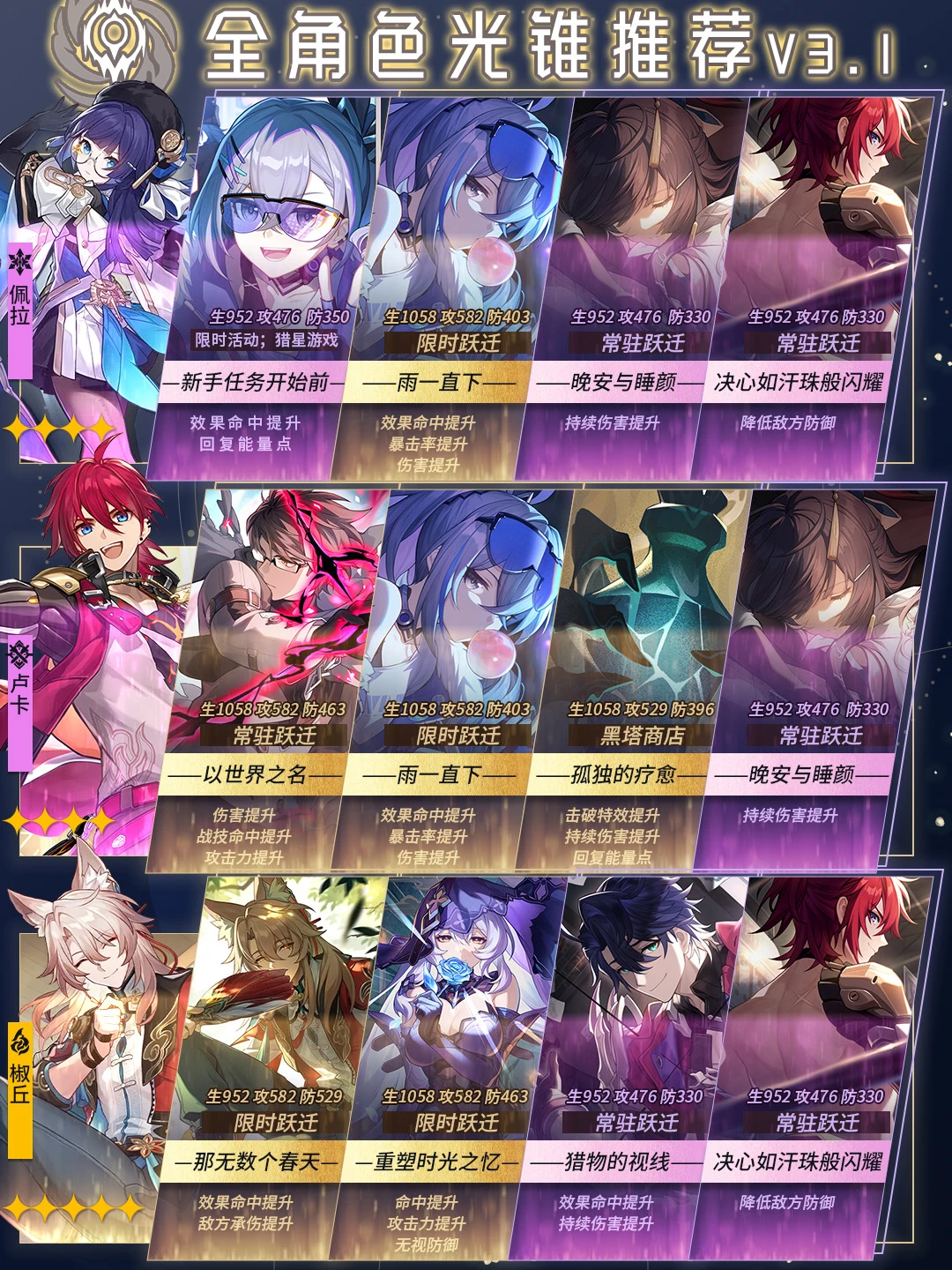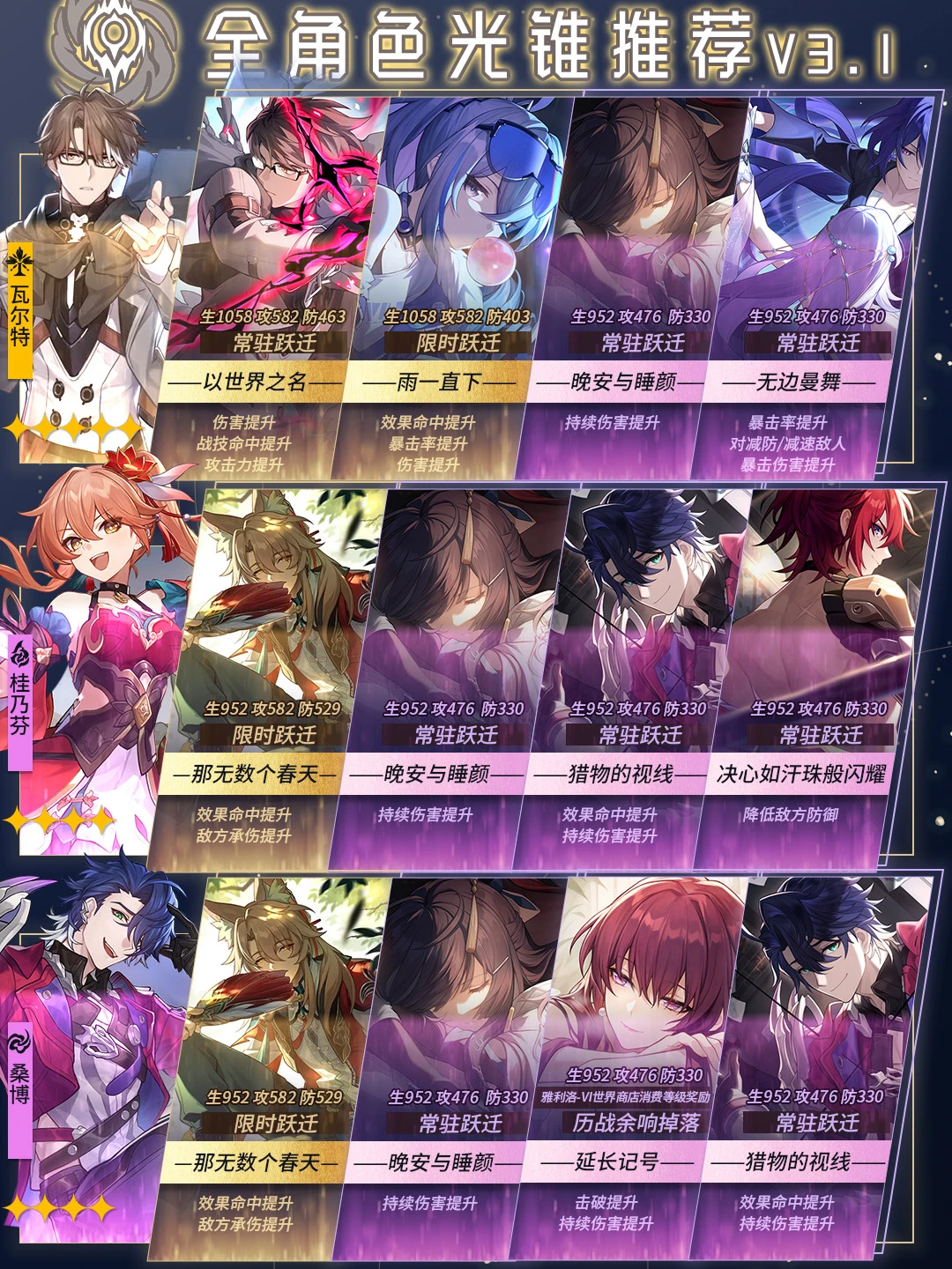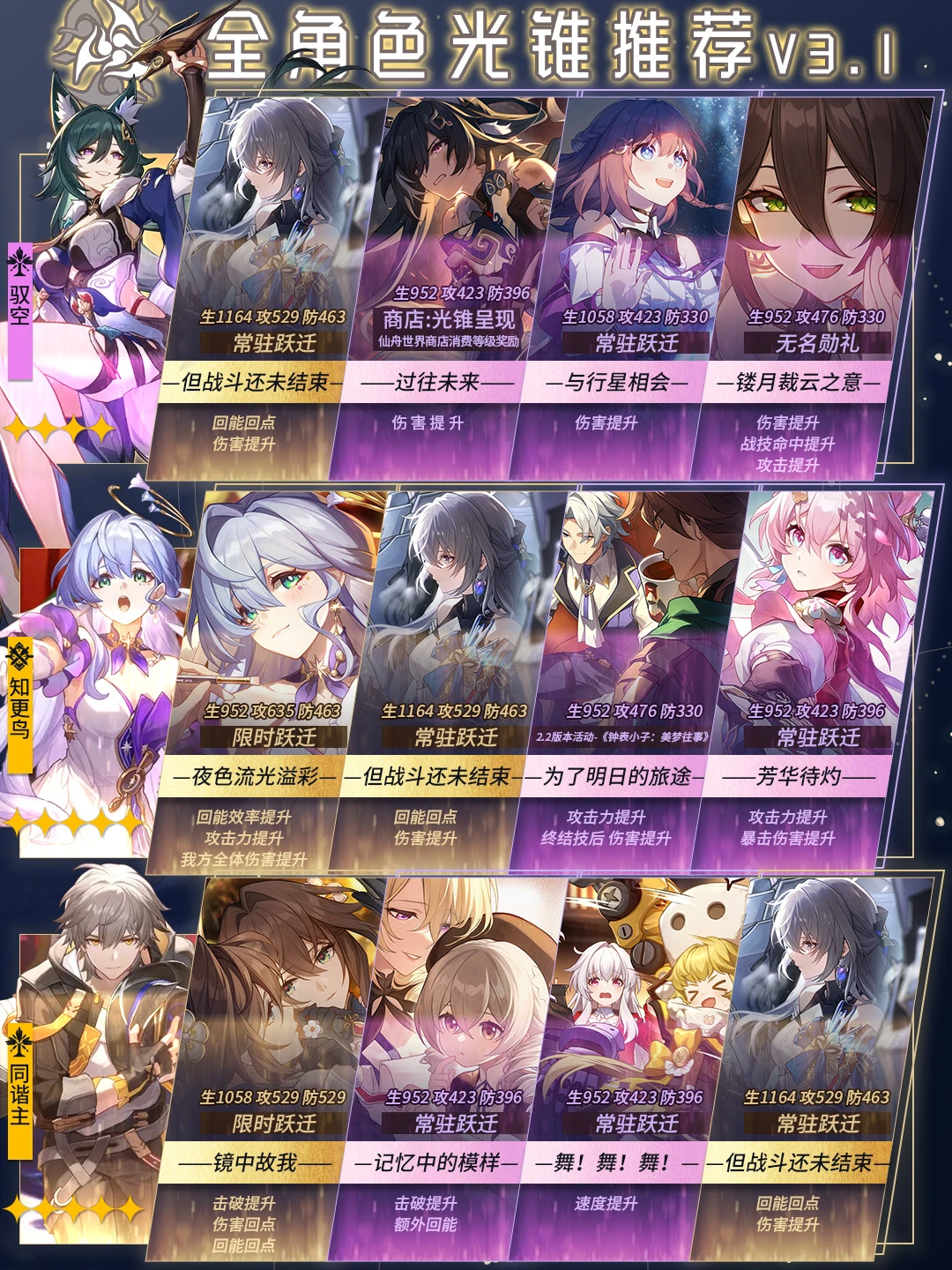 大家好 今天给大家整理了截至目前版本全角色光锥指南 分别有角色试用的五星光锥和四星光锥,以及光锥对角色的提升数据以及获取途径 感谢大家的支持,如若对体内不懂的地方可以评论留言告诉我,喜欢的点赞支持一下,我会努力把最好的攻略分享给大家使用!