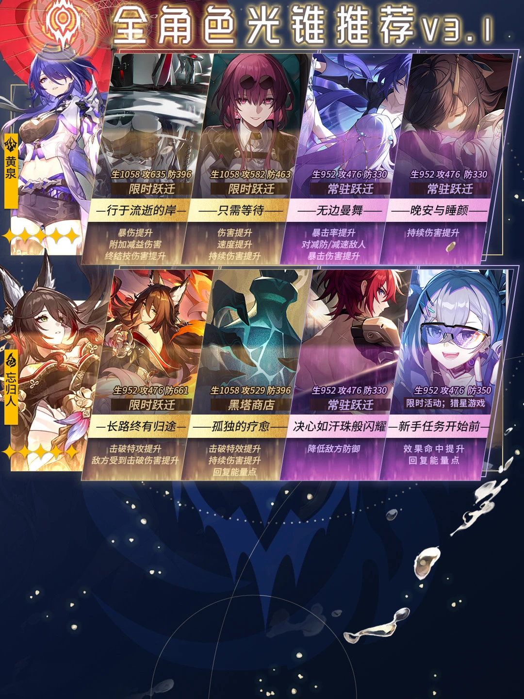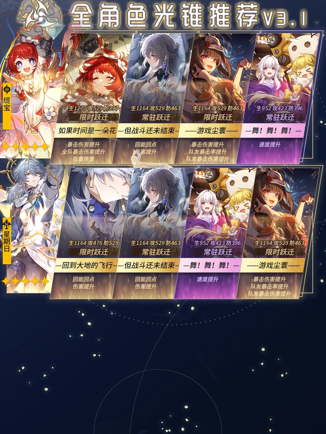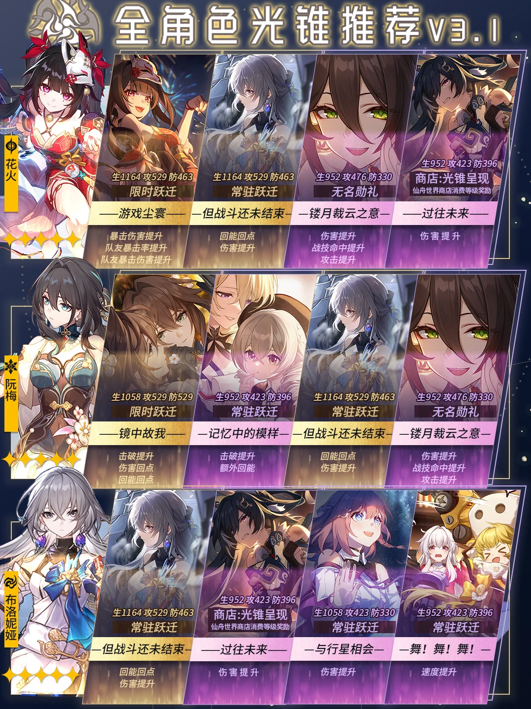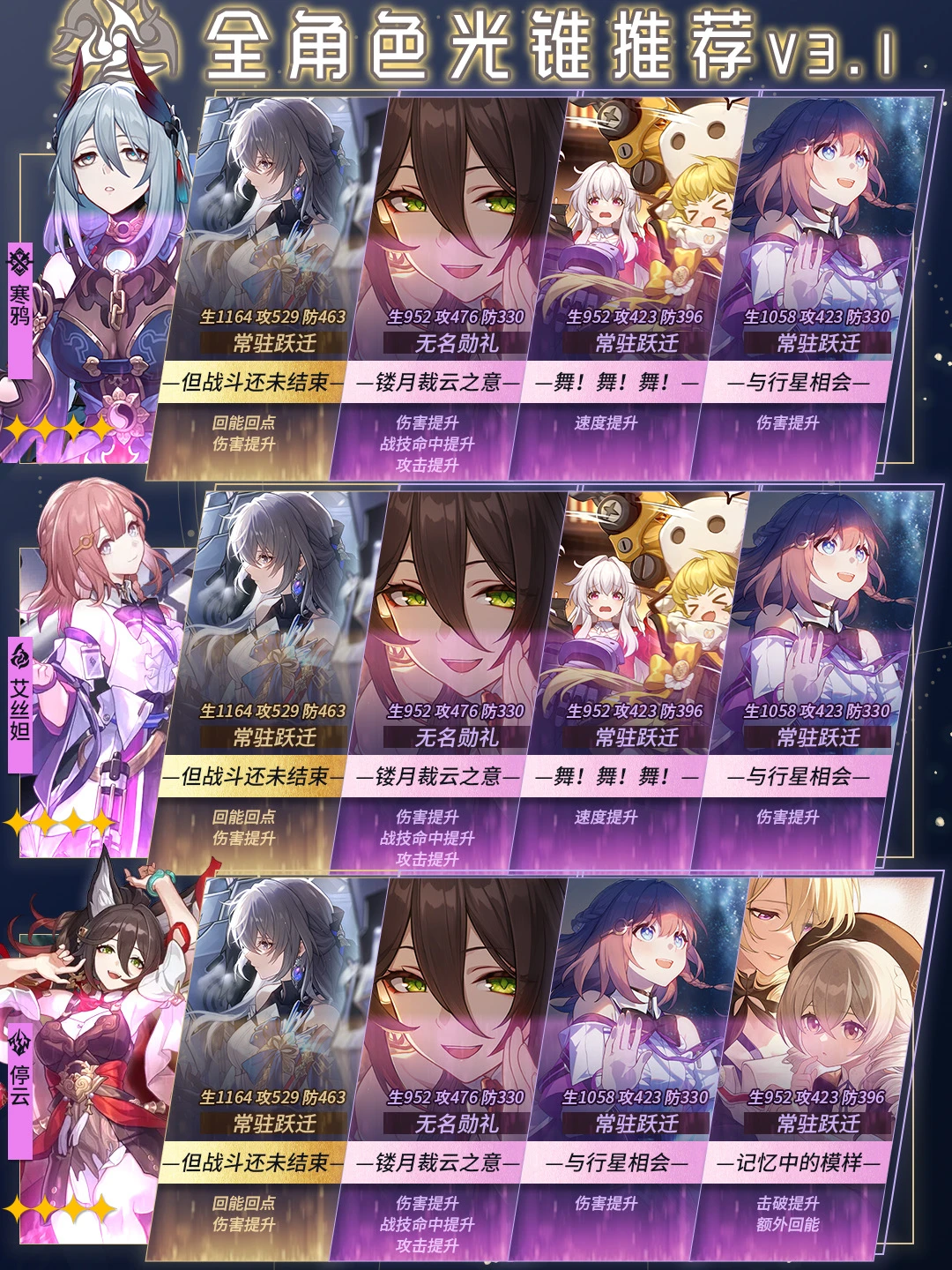 大家好 今天给大家整理了截至目前版本全角色光锥指南 分别有角色试用的五星光锥和四星光锥,以及光锥对角色的提升数据以及获取途径 感谢大家的支持,如若对体内不懂的地方可以评论留言告诉我,喜欢的点赞支持一下,我会努力把最好的攻略分享给大家使用!