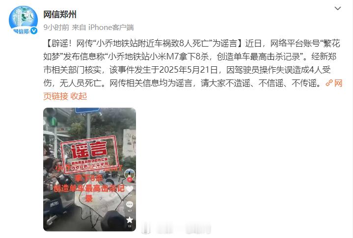 网信郑州 发文辟谣,称网传“小乔地铁站附近小米 M7车祸致 8 人死亡”为谣言。