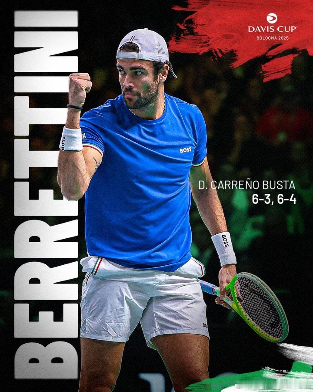 贝雷迪尼🇮🇹最近3年戴维斯杯单打全胜!在以6:3,6:4横扫布斯塔🇪🇸后,贝雷迪尼为意大利拿到第一分,他在最近三年戴维斯杯单打保持全胜,看他的拍下败将:2022年✅丘里奇🇭🇷✅巴埃斯🇦🇷✅ 伊梅尔🇪🇸2024✅ 丰塞卡🇧🇷✅布洛克斯🇧🇪✅范·德赞德西罗普🇳🇱✅科基纳基斯🇦🇺✅范·德赞德西罗普🇳🇱2025✅罗迪奥诺夫🇦🇹✅科利尼翁🇧🇪✅布斯塔🇪🇸意大利国家英雄🦸♂️