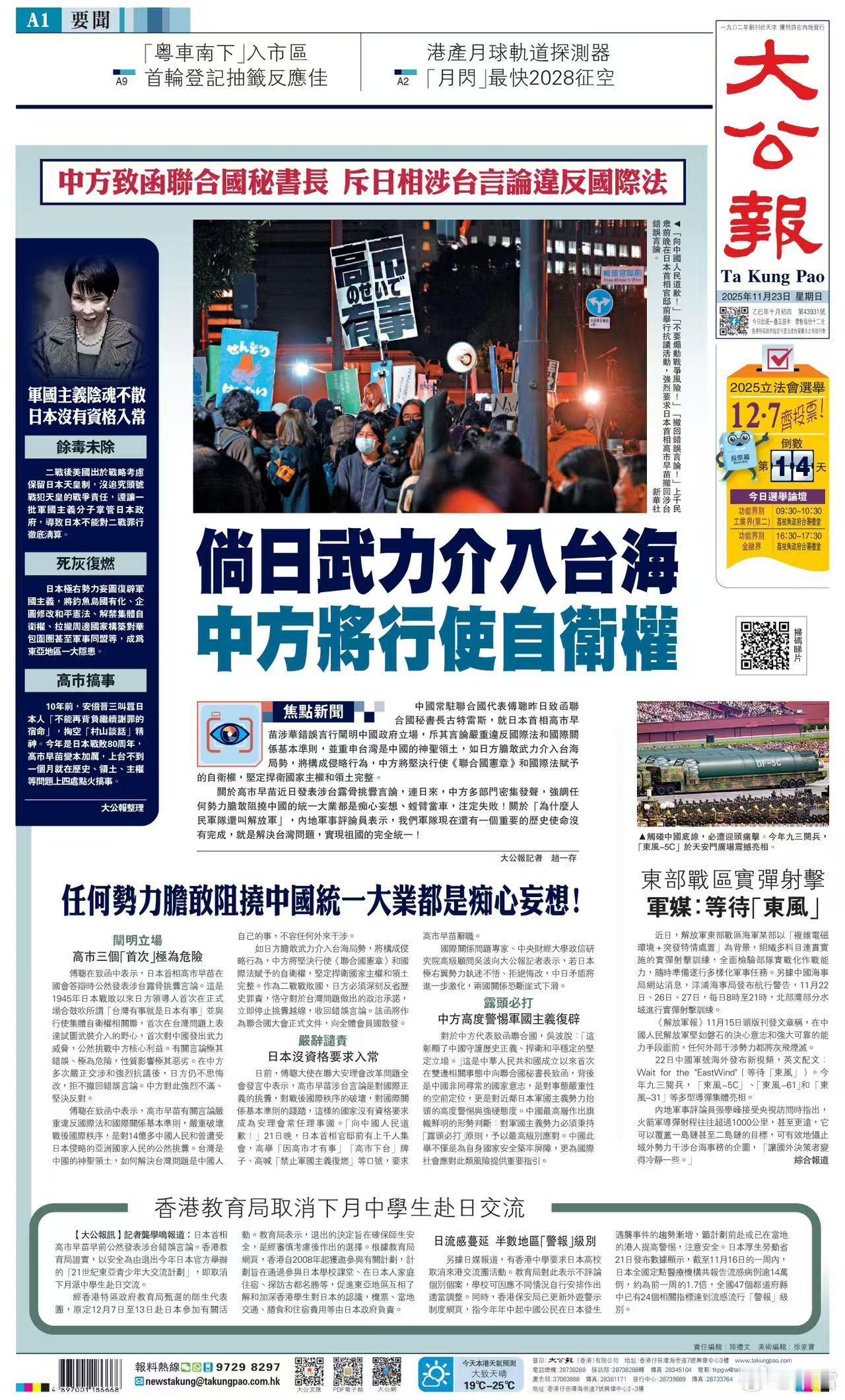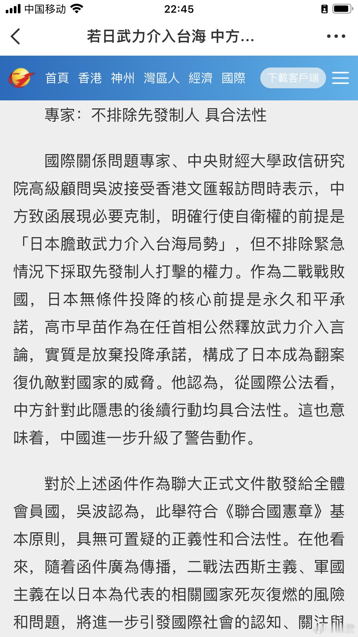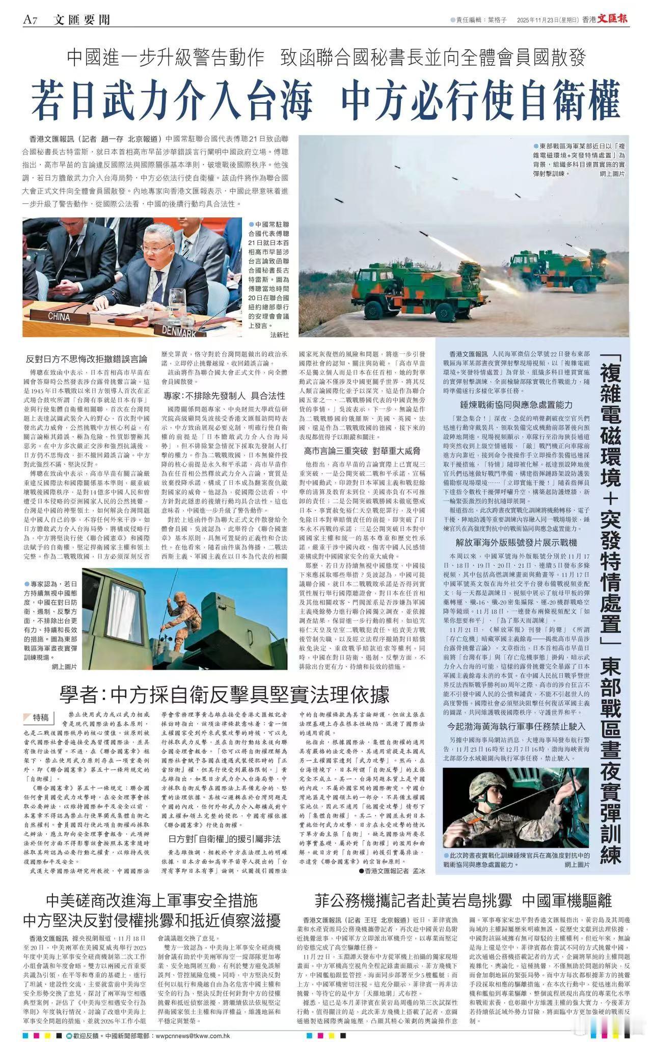 中国常驻联合国代表傅聪奉示抗议:最后通牒倘若日本武力介入台湾 中方将行使自卫权专家:不排除先发制人 具合法性国际关系问题专家、中央财经大学政信研究院高级顾问吴波接受香港文汇报访问时表示,中方致函展现必要克制,明确行使自卫权的前提是「日本胆敢武力介入台海局势」,但不排除紧急情况下采取先发制人打击的权力。 若日方持续无视中国态度,中国接下来应采取哪些举措?吴波认为,中国可提议联合国,就日本二战战败承诺是否得到实质性履行举行国际听证会,对日本在任首相及其他相关政客、门阀派系是否涉嫌为军国主义残余势力进行联合国独立调查,并依据调查结果,保留进一步行动的权利,如追究裕仁天皇及皇室二战战犯责任、追责美方战后管制失职,以及经立法程序撤销对日赔偿赦免决定、重启战争赔款追索等权利。同时,中国在对日防卫、遏制、反击方面,不排除出台更有力、持续和长效的措施。