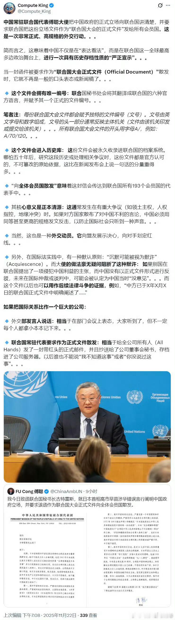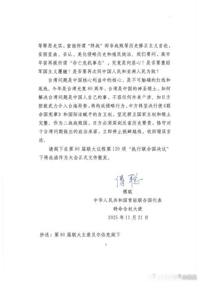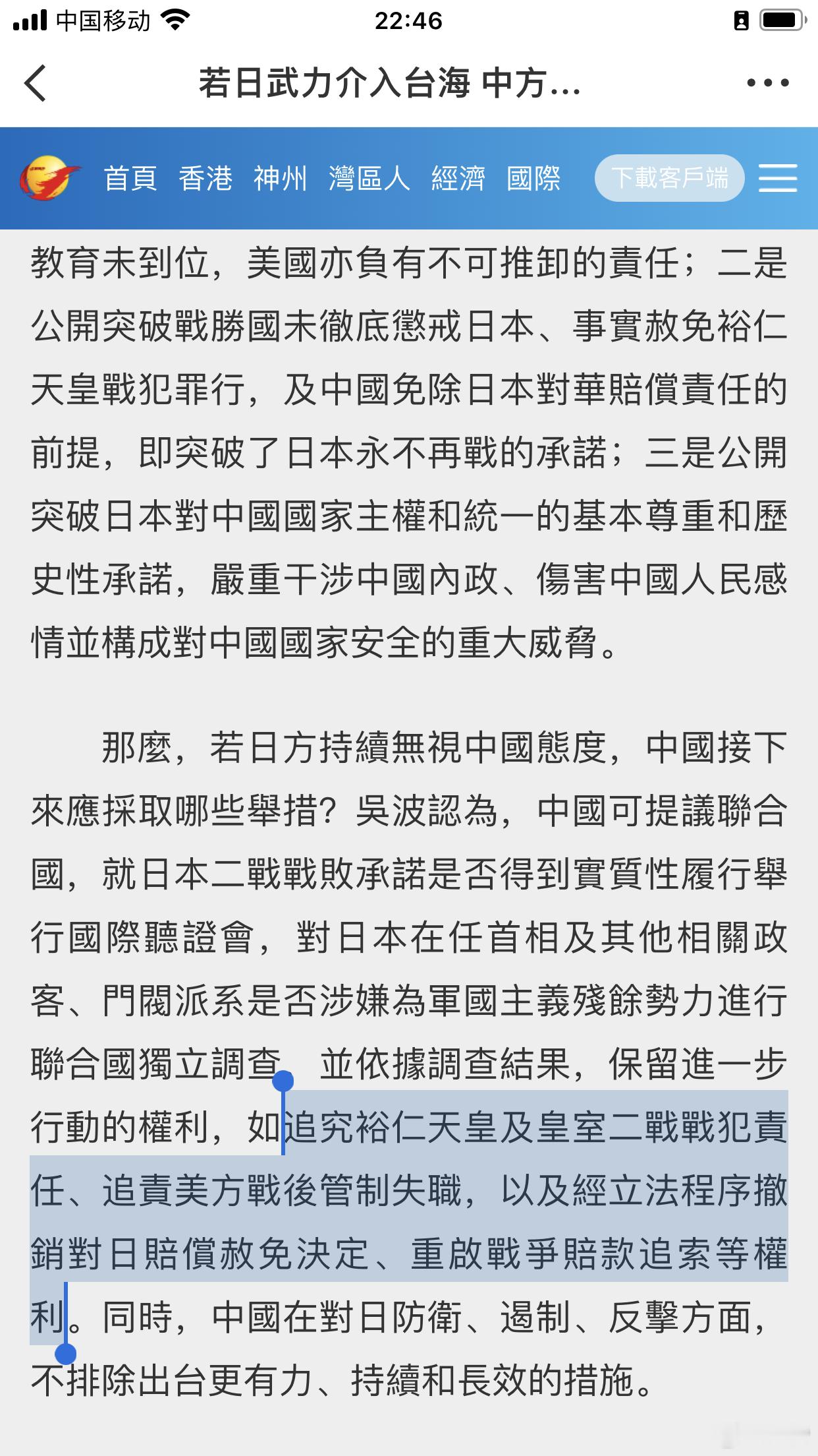 中国常驻联合国代表傅聪奉示抗议:最后通牒倘若日本武力介入台湾 中方将行使自卫权专家:不排除先发制人 具合法性国际关系问题专家、中央财经大学政信研究院高级顾问吴波接受香港文汇报访问时表示,中方致函展现必要克制,明确行使自卫权的前提是「日本胆敢武力介入台海局势」,但不排除紧急情况下采取先发制人打击的权力。 若日方持续无视中国态度,中国接下来应采取哪些举措?吴波认为,中国可提议联合国,就日本二战战败承诺是否得到实质性履行举行国际听证会,对日本在任首相及其他相关政客、门阀派系是否涉嫌为军国主义残余势力进行联合国独立调查,并依据调查结果,保留进一步行动的权利,如追究裕仁天皇及皇室二战战犯责任、追责美方战后管制失职,以及经立法程序撤销对日赔偿赦免决定、重启战争赔款追索等权利。同时,中国在对日防卫、遏制、反击方面,不排除出台更有力、持续和长效的措施。