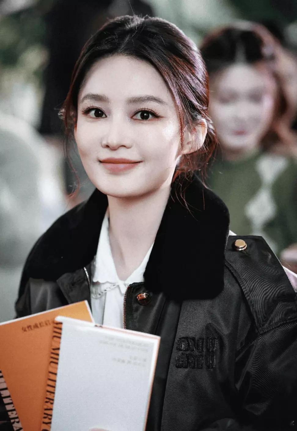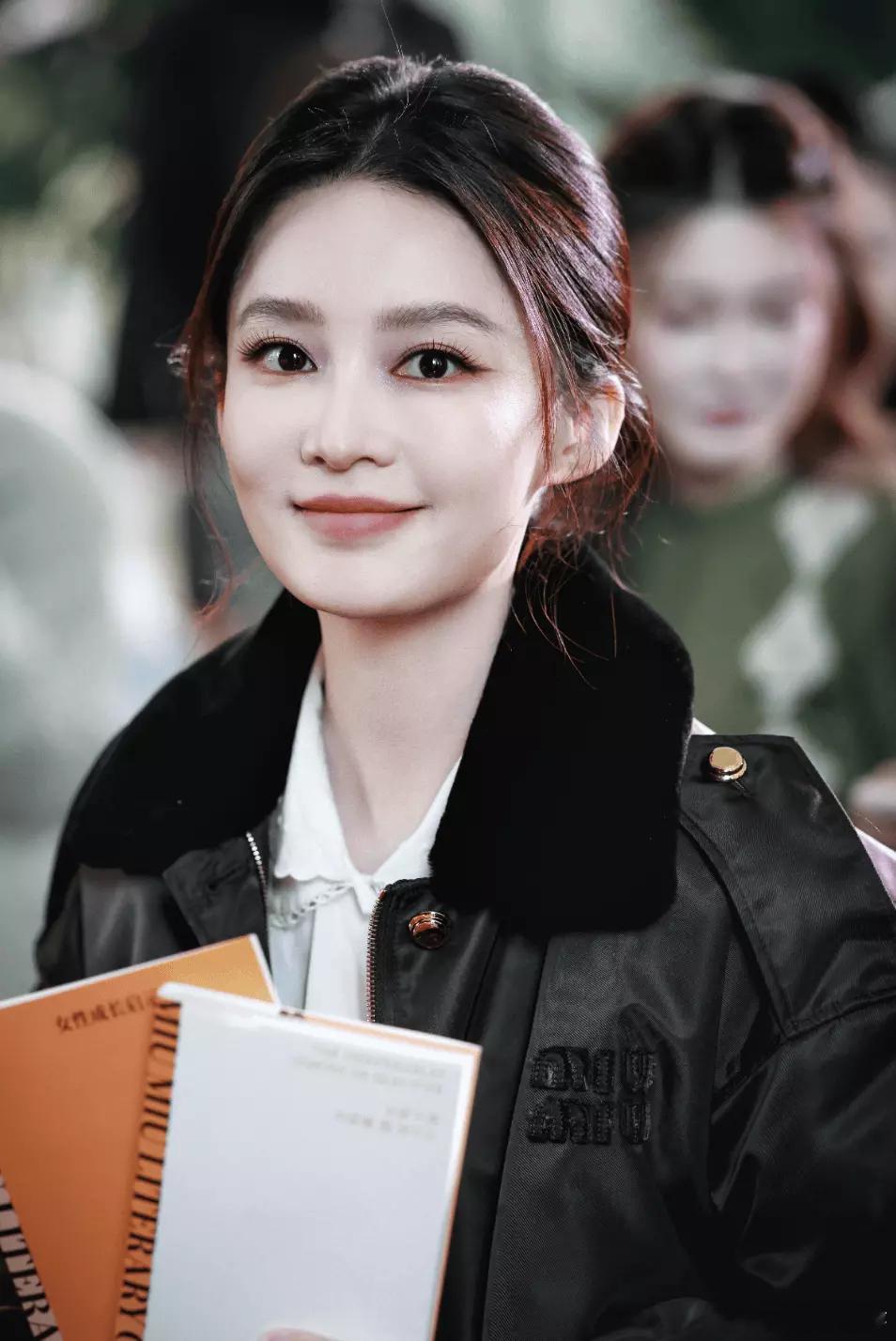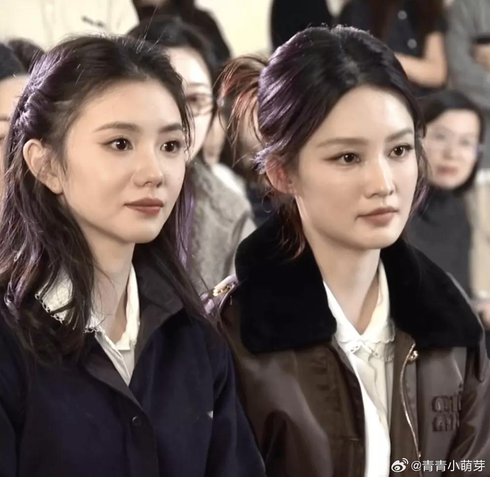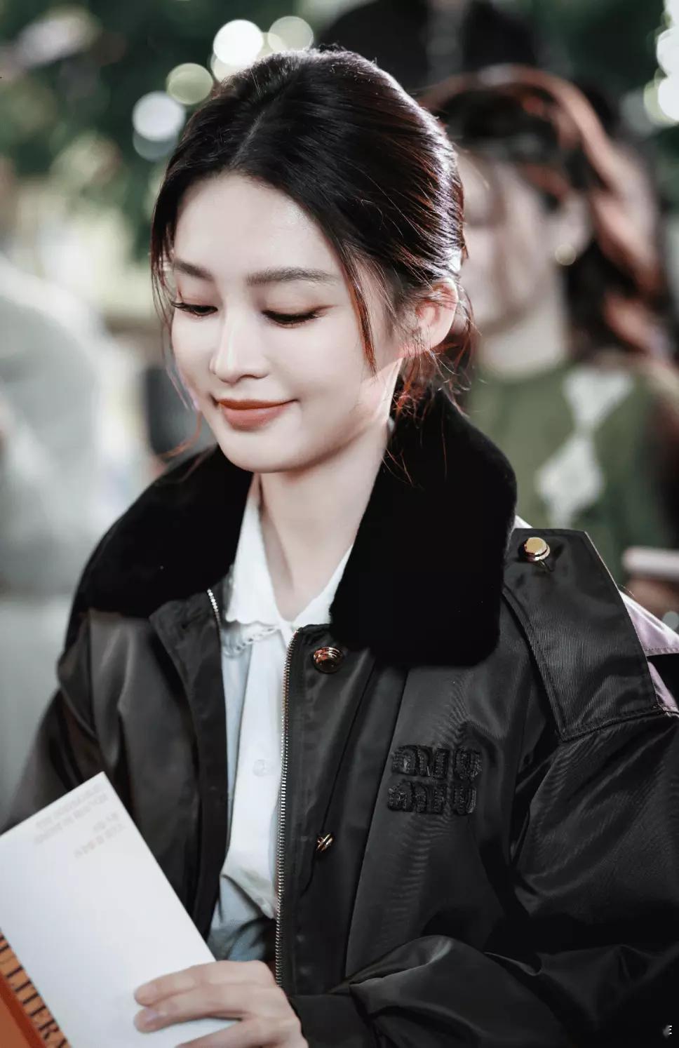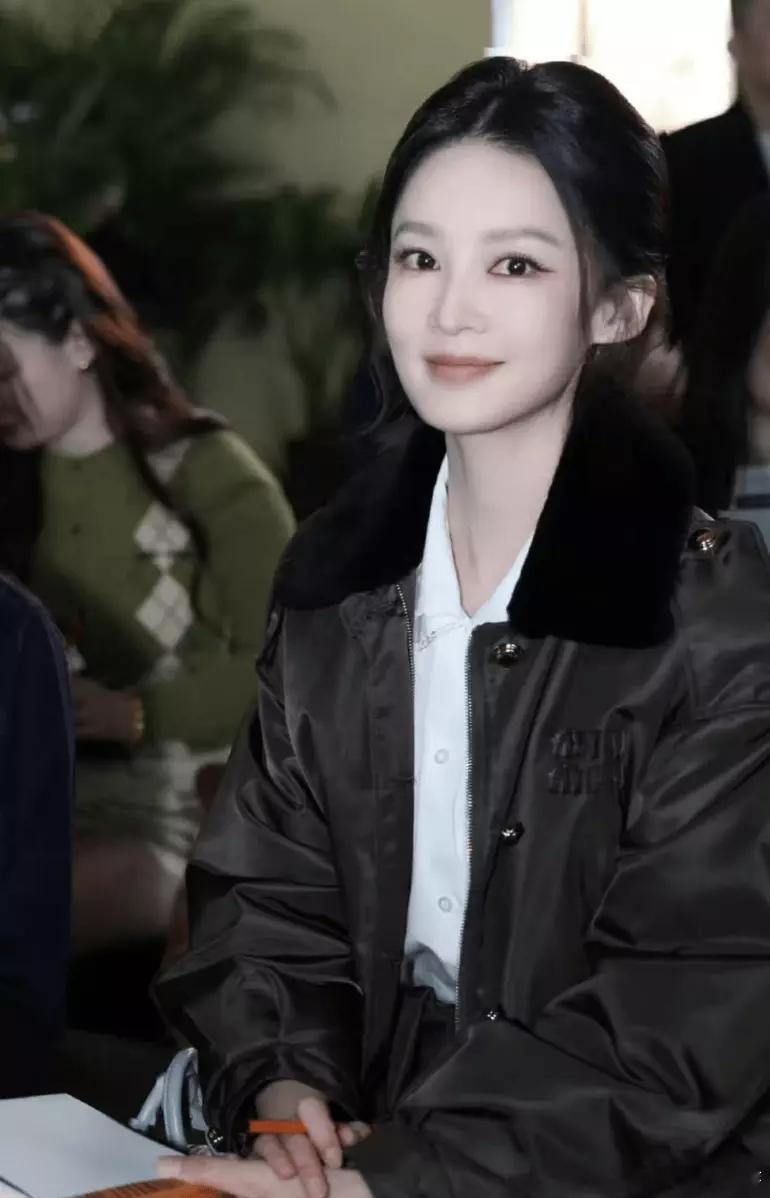 李沁工装夹克搭配紫色丝袜 清冷感和甜酷风完美融合