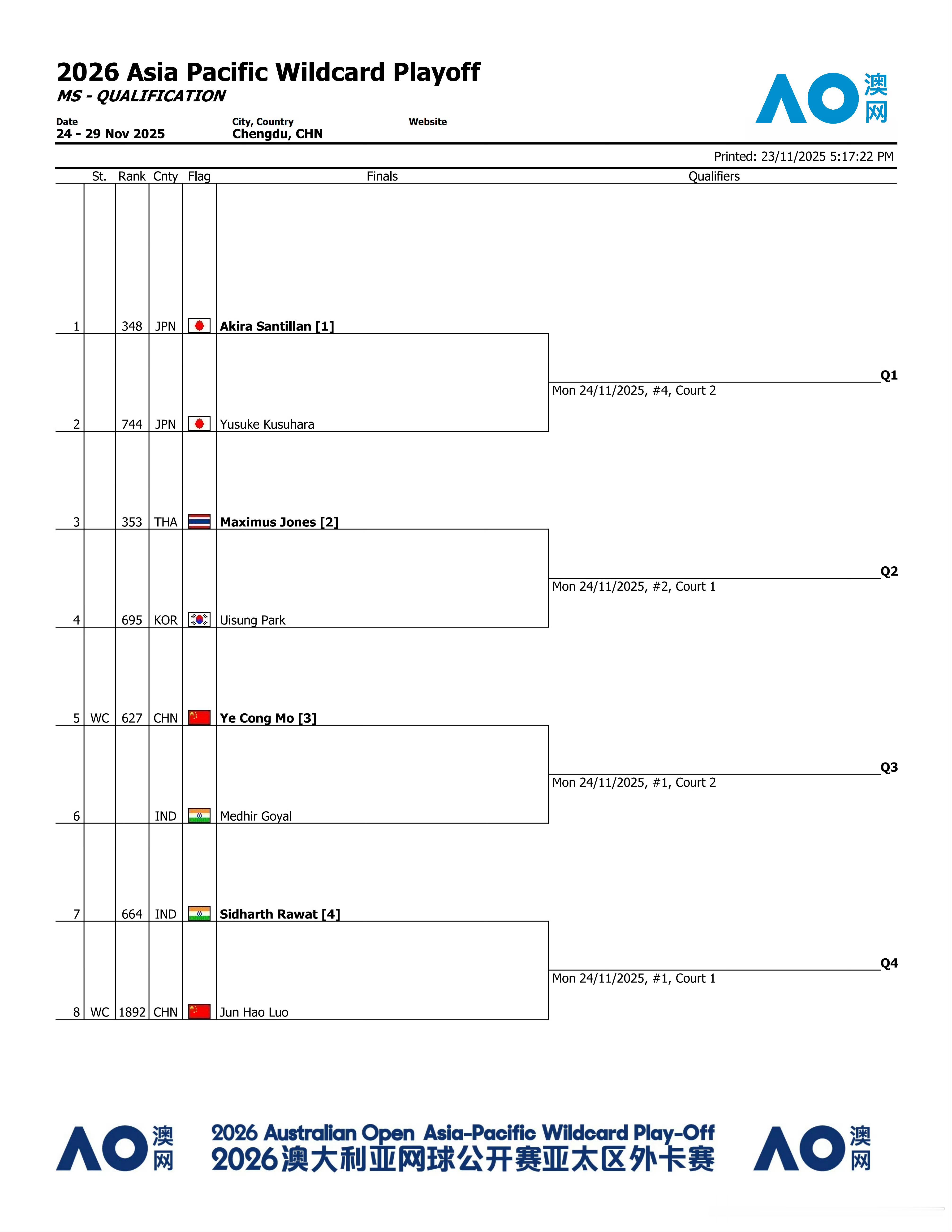 亚太区外卡赛男单资格赛签表🇨🇳莫业聪 vs 🇮🇳戈亚尔🇨🇳罗俊昊 vs 🇮🇳拉瓦特 丨