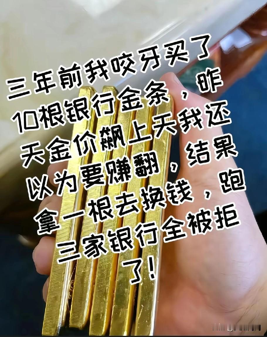 三年前,我咬着牙买了10根银行金条。昨天一看金价涨疯了,我还美滋滋以为要赚大发了。结果拿一根去银行换钱,连着跑三家,全给我拒了! 拒的理由居然是金条包装被我撕了,柜员悄悄说,撕了包装就得化条测纯度,他们怕麻烦还怕有纠纷。可当初买的时候,销售把售后吹得那叫一个好听,压根没提包装不能撕这事儿啊!现在金条只能干巴巴躺抽屉里,金价越涨我心里越烦。银行这规矩,也太不替咱普通人着想了,就知道自己图省事。 依我看,银行完全可以弄个更灵活的检测办法,别死盯着“包装完好”这一条。咱买金条是为了避险增值,又不是买个宝贝疙瘩供着。大家要是碰到我这种情况,会咋整?有没有啥靠谱法子能把金条换成钱?评论区的大神们,快来给我支支招呀!