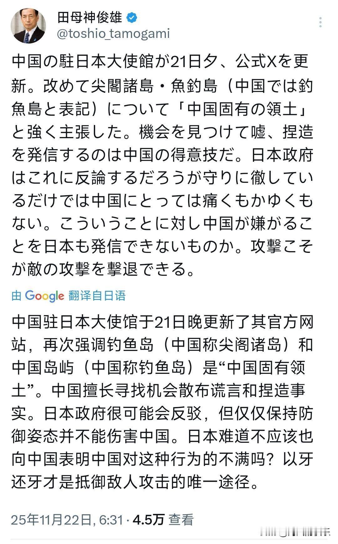 日本前高官妄议钓鱼岛主权 中方驳斥其军国主义言论 据外媒报道日本航空自卫队前参谋长田母神俊雄11月22日发表挑衅言论,妄称中国驻日大使馆在社交媒体上重申钓鱼岛主权是"谎言",并叫嚣"以牙还牙"。中方对此予以严正驳斥。 田母神俊雄的言论罔顾历史事实。钓鱼岛及其附属岛屿自古以来就是中国固有领土,有大量历史文献和考古证据支持。中国驻日大使馆的表述完全符合国际法和历史事实。 中国外交部发言人指出,此类言论暴露了日本某些势力错误的历史观和危险的军国主义倾向。中方敦促日方正视历史,停止在钓鱼岛问题上制造事端。 分析人士认为,这种挑衅性言论无助于地区和平稳定,只会加剧紧张局势。中方始终坚持通过对话协商解决争端,维护地区和平稳定。
