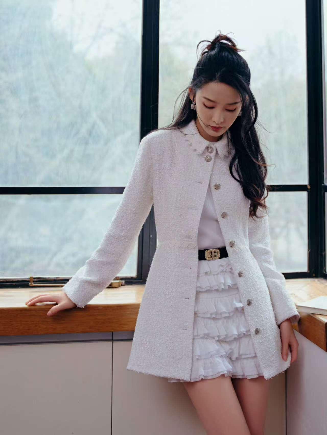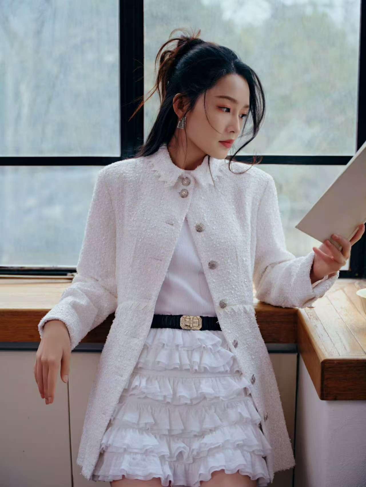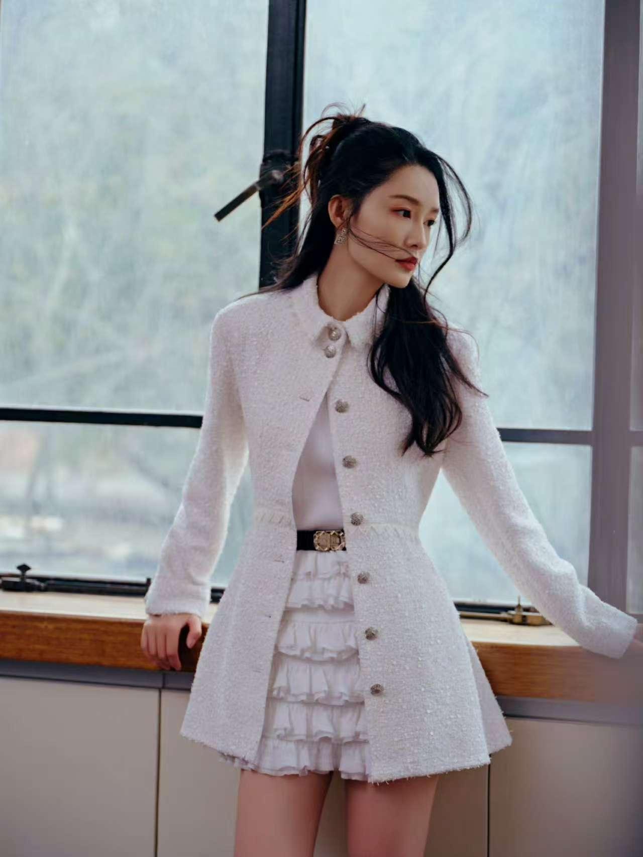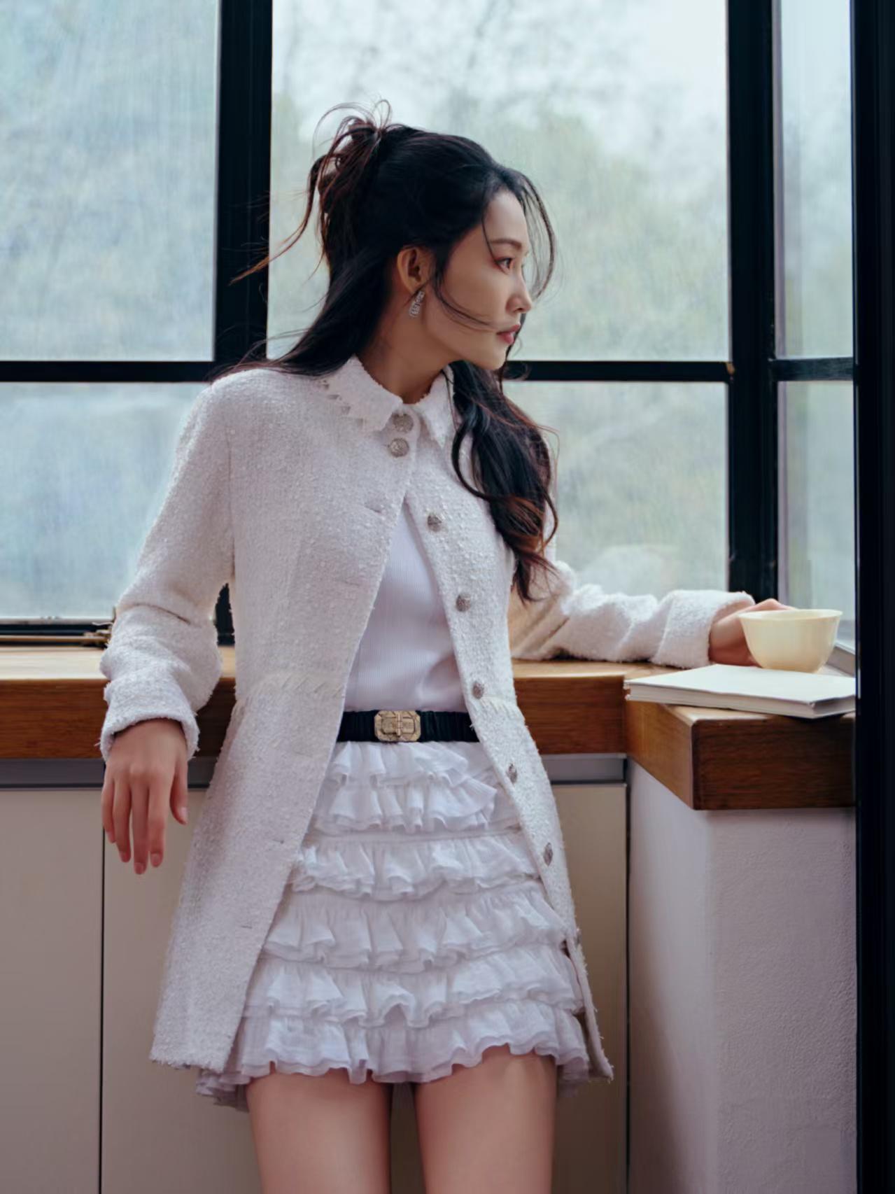 李沁这身小香风的“撩人机”,简直藏在每一处细枝末节里:银白钻扣顺着肩线一颗挨一颗往下排,不是晃眼的扎亮,是像把晨雾里的碎光揉进了金属里。顺着她的肩线轻轻垂落时,细闪勾得肩颈皮肤都泛着一层软乎乎的柔光。 她随手往窗边铁艺栏杆上一搭,那条窄窄的黑腰带像量身定做的“腰线开关”,一收就掐住比她握着栏杆的手腕还细的蚂蚁腰,腰侧的软肉顺着腰带弧度轻轻陷下去一点,俏得刚好。 裙摆刚好停在大腿最纤细的位置,露出来的腿在窗边的漫射光里白得发亮,连瓷砖地面都映着腿边的柔光,连玻璃窗上的倒影都跟着她的姿态轻轻晃——这哪是穿衣服,是把“清冷里藏着点勾人”的分寸感,精准焊在了每一处细节里。