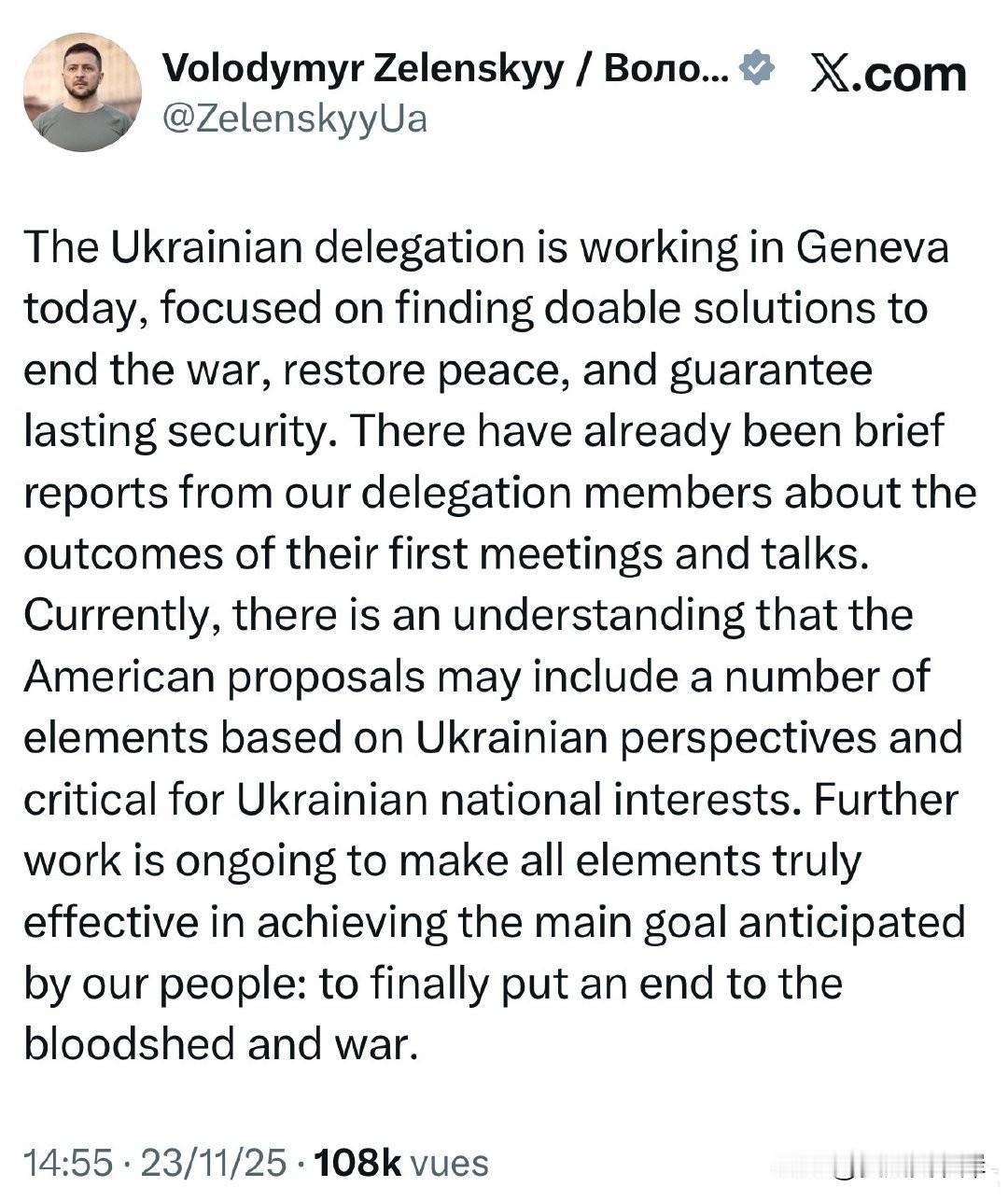 国际政治有多残酷?看看泽圣的表现就知道了,川普把乌克兰卖了,但其总统却要公开表示“卖的好”。 “乌克兰代表团今天在日内瓦开展工作,重点寻找能够结束战争、恢复和平并确保持久安全的可行方案。代表团成员已就首次会晤和会谈的结果提交了简要报告。 目前了解到,美方提出的方案可能包含若干基于乌方立场、对乌克兰国家利益至关重要的内容。相关工作仍在继续,以使所有内容真正有效地实现我国人民所期盼的主要目标:最终结束流血与战争。 ”