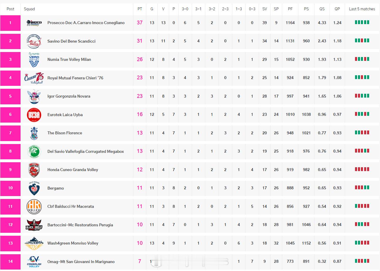 【意甲女排最新积分榜】11月23日,意甲女排第11轮结束。科内利亚诺13连胜37分继续遥遥领先,斯坎迪奇11胜2负31分领跑第二集团,少赛一场的米兰8胜4负26分暂列第三,少赛两场的基耶里和诺瓦拉均为8胜3负23分位列四五位;取得第三胜的贝尔加莫从倒数第二升至第十位,圣乔瓦尼继续排名倒数第一。