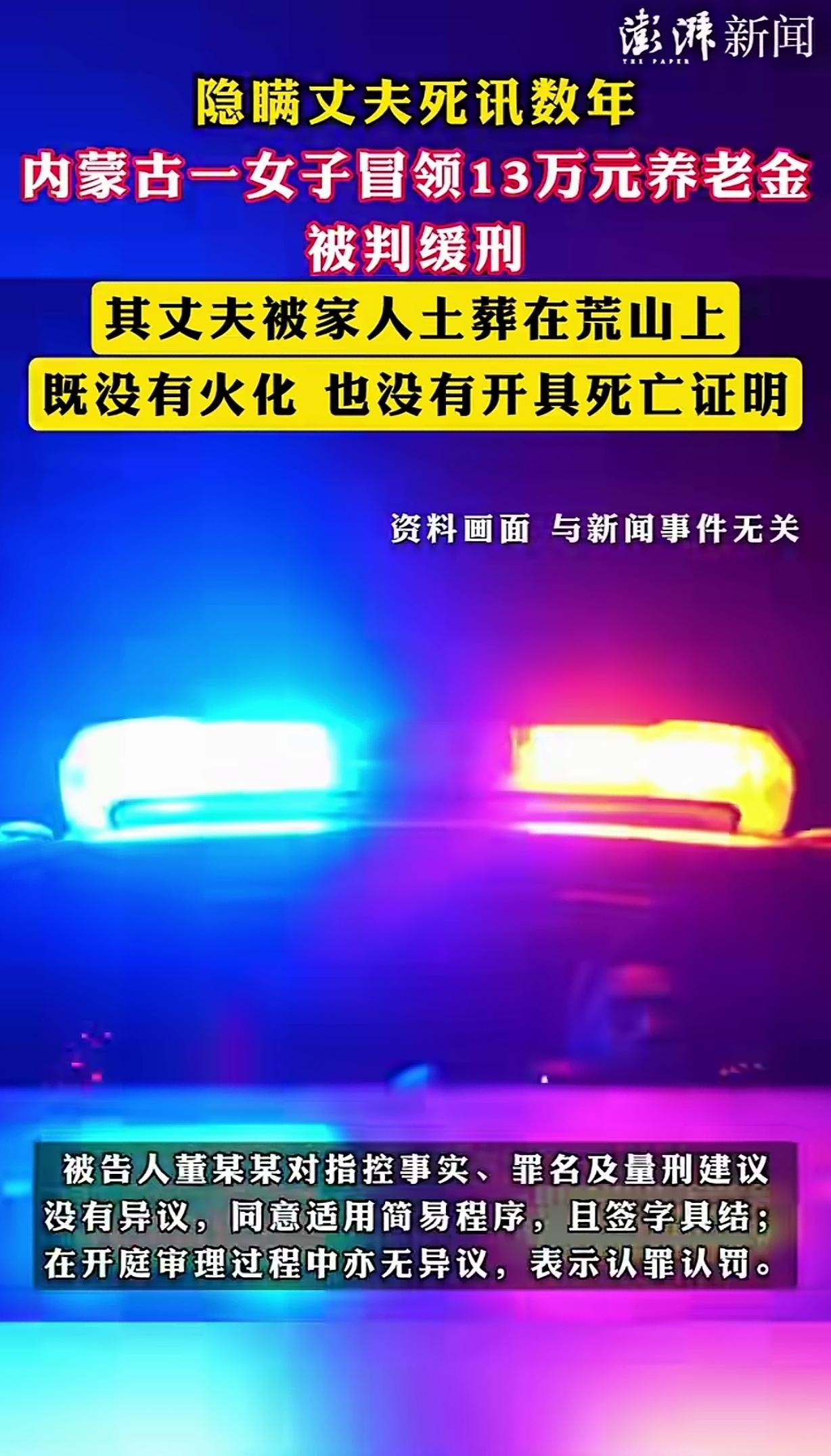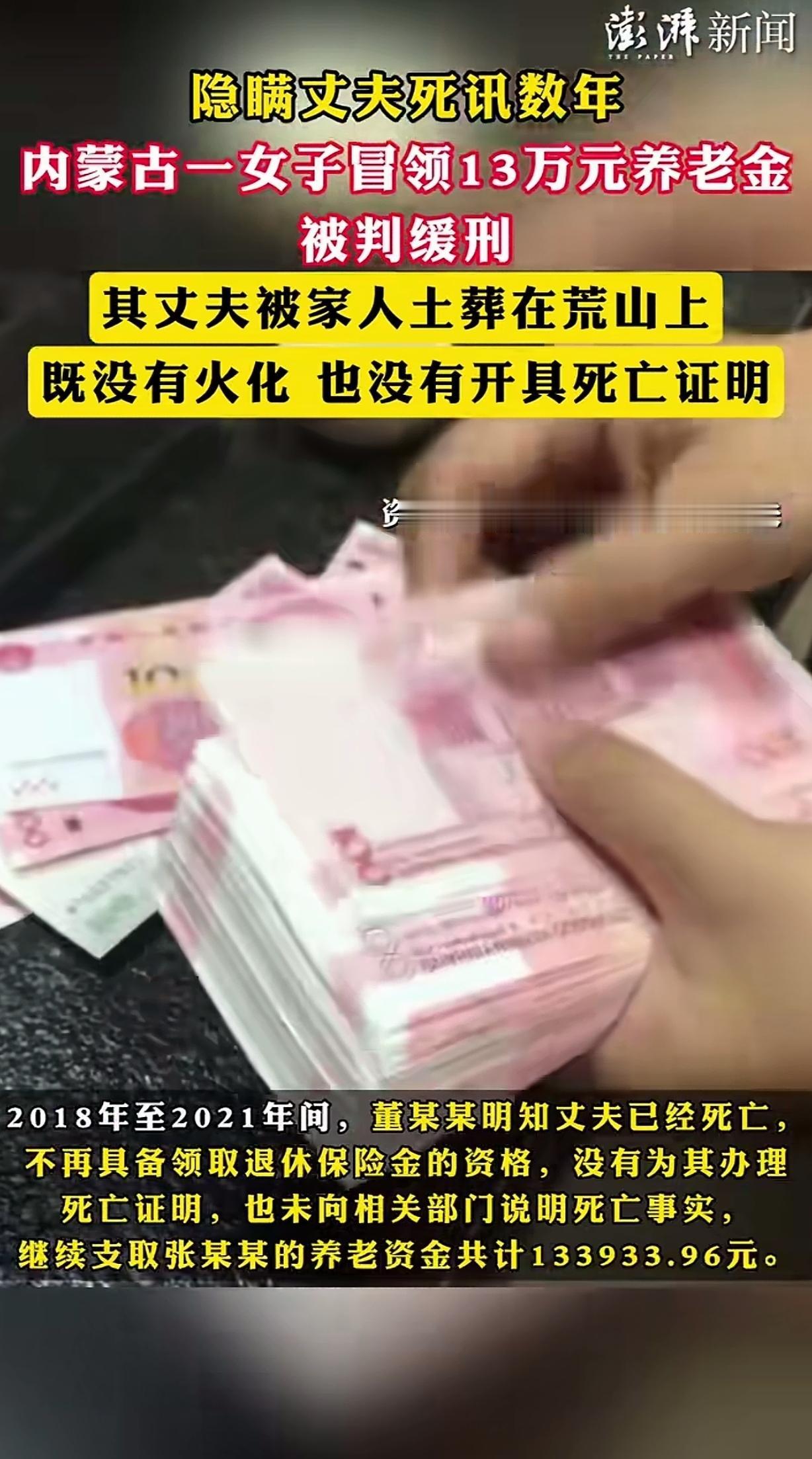 “好一个瞒天过海!”内蒙古,一女子丈夫去世后,她既没火化,也没有开死亡证明,直接把丈夫埋在家附近的荒山上,然后4年悄悄领了亡夫133933.96元养老金,没想到东窗事发,结局让她彻底傻眼。网友:不是每年要养老认证吗? 2017年12月,女子董某的丈夫张某死亡,案例里没交代她丈夫是病逝还是出了意外,也没交代年龄,反正是到了拿养老金的年纪。 对于董某来说,就跟天塌了一样,俗话说,少年夫妻老来伴,到了相扶相携的年纪,突然另一半先走一步,留下她孤苦伶仃,儿女再孝顺,也没有老伴知疼知热。 但董某接下来的操作,可以说大跌眼镜,按理说丈夫离世,应该开死亡证明进行火化,然后让他入土为安,自己振作精神,接受现实。 可董某竟然偷摸把丈夫埋在家里东南方向的荒山上,这是违反规定的,可她还是一意孤行。 她这么做的目的是什么呢?当然不是无缘无故的,然后,董某就从2018年开始,领取丈夫的养老金,虽然每月几千元,但董某吃喝拉撒够用了,还能攒点养老钱。 可没有不透风的墙,直到2021年,她终于东窗事发,而她已经偷偷领取了亡夫的133933.96元养老金。 结果就是,最后一次领取的养老金,还没被董某捂热乎,包括以前领取的,全部给吐出来退回去了。 这还不算,董某还被公诉机关指控,11月10日,法院依法作出判决,董某犯诈骗罪,判处有期徒刑3年,缓刑4年,并处罚金人民币15000元。 也就是说,董某便宜没占到,反而名誉扫地,还倒搭15000元,偷鸡不成蚀把米。 董某之所以被判缓刑,是因为她对自己的罪行供认不讳,如实承认罪行,属于坦白从宽,可以从轻处罚。 而且,案发后,董某积极全额退还了涉案诈骗资金,可酌情从轻处罚,董某也自愿认罪认罚,可依法从宽处理。 这件事尘埃落定,但大家并不买账,都提出质疑,应该不可能吧?几个月可以,每年都认证,怎么能认证通过呢?我父亲今年81岁,每个月给社区拍照片认证。 怎么冒领?每年老人都要现场拍照证明还活着,才能领养老金!这种行为,危害性比较大,应该判实刑。 需要修改有关规定,如果女方没有退休金的情况下,男方死亡后其退休金应该继续发,直到女方死亡,可降低发放比例,女方另嫁就停发。 这个是相关部门的事,每年都刷脸一次,不刷脸认证就停发工资了。责任在相关部门这,不作为应该追究,责任不在领钱家属! 这事儿,真是把人气笑了,又心头发寒!一个大活人,悄没声儿在荒山上一埋四年,养老金愣是一分不少照领? 咱老百姓每年吭哧吭哧拍照片、按指纹、刷脸认证折腾半天,图啥?合着规矩全是给老实人定的,董某这操作简直是给养老金系统捅了个大窟窿眼! 你说她不懂法?不见得!丈夫一走,她心里那本账算得门儿清:开死亡证明?养老金立马停!装不知道?每月钱照拿!荒山上土一埋,嘴皮子一闭,四年13万多到手! 这哪是糊涂,分明是拿公家钱袋子当自家存折使!咱隔壁张大爷腿脚不利索,年年被闺女搀着去社区举当天报纸拍照;李奶奶八十多了还得学刷脸,眯着眼对手机折腾半天…管得严的恨不得让活人证明自己活着,到董某这儿倒好,死人四年不露面照样领钱?讽刺到家了! 有人替她喊冤:没退休金的老妇女,拿走老伴养老金咋了?这话经不起琢磨!养老金是活人的保命钱,不是遗产! 现在可好,她退赃又挨罚,落个诈骗犯名声,早知如此何必当初?贪小便宜吃大牢饭,值吗! 更该拍桌子的,是管养老金那帮人!四年啊,系统是摆设吗?哪怕抽查一次上门呢?哪怕让老人视频说句话呢?大家都知道要“年年认证”,怎么到董某丈夫这儿就一路绿灯? 出事就推给“家属隐瞒”,监管的眼睛长在头顶上?要我说,蛀虫能啃穿钱袋子,看仓库的脱不了干系! 贪心人总以为能钻空子,最后反被空子咬断腿;管事的要再装睡,大家的养命钱真成某些人眼里的大肥肉了!咱就盯着,以后认证是动真格还是继续走过场! 《刑法》第266条规定:诈骗公私财物,数额较大的,处三年以下有期徒刑、拘役或者管制,并处或者单处罚金。 董某行为完全符合诈骗罪构成要件:隐瞒真相,董某明知丈夫死亡后养老金领取资格已丧失,却故意不办理死亡证明、不告知社保部门,持续4年通过“冒领”方式获取养老金133,933.96元。 非法占有目的,她的行为本质是将公有财产养老金据为己有,主观恶意明显,且金额远超诈骗罪“数额较大”,3万元以上标准,依法应判处三年以上有期徒刑。 董某被判有期徒刑3年缓刑4年+罚金1.5万元,是基于以下法定从轻情节:全额退赃,案发后主动退还全部冒领资金133,933.96元。 认罪认罚,对犯罪事实无异议、自愿签署认罪认罚具结书,符合《刑事诉讼法》从宽处理规定。 坦白情节,归案后如实供述,符合《刑法》第67条坦白从宽条款。 如果不是上述情节,按13万元金额,已达“数额巨大”,基准刑应在3-10年。 关注@灋律盐究员 学法辩是非,用法止纷争。
