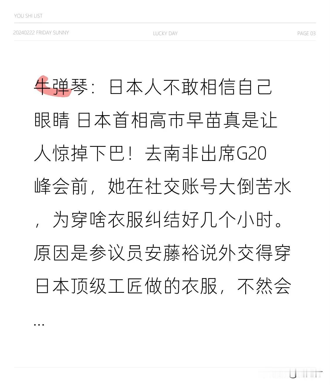 日本人难以置信,日本首相高市早苗的行为实在令人大跌眼镜!前往南非出席G20峰会前,她在社交账号抱怨,为穿什么衣服纠结了数小时。原因是参议员安藤裕称,外交场合要穿日本顶级工匠制作的衣服,否则会被轻视。 当下日本情况如何?经济复苏艰难,通胀压力巨大,民众生活成本飙升,外交关系紧张。高市早苗却把精力花在穿搭上,还觉得穿得好能在外交谈判中占优势。网友吐槽不断,指责她不解决民生与外交难题,却纠结穿着是否得体,太过轻浮。与冯德莱恩、梅洛尼等务实女领导人相比,高下立见,也难怪日本人难以置信。